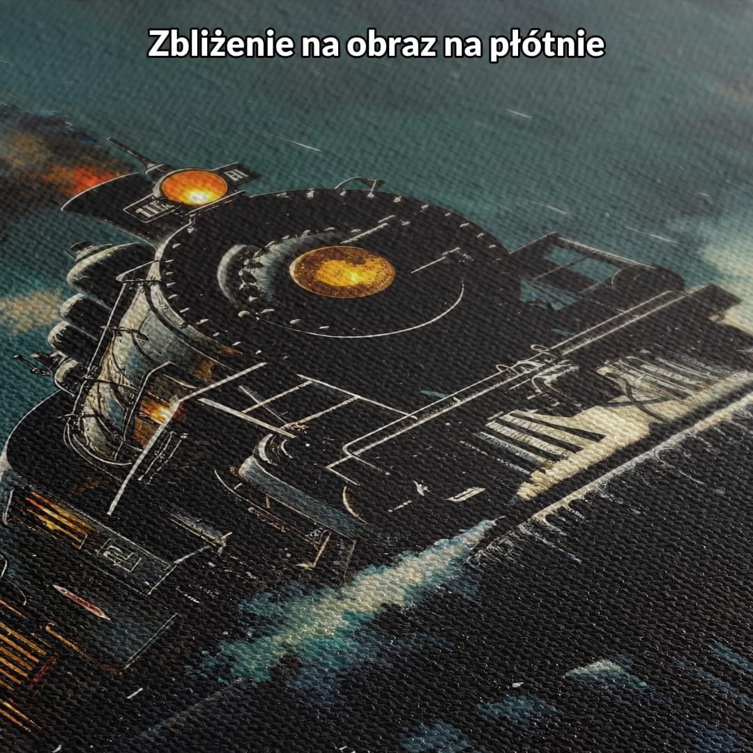 - Realistyczny obraz na płótnie z motywem parowej lokomotywy nocą
