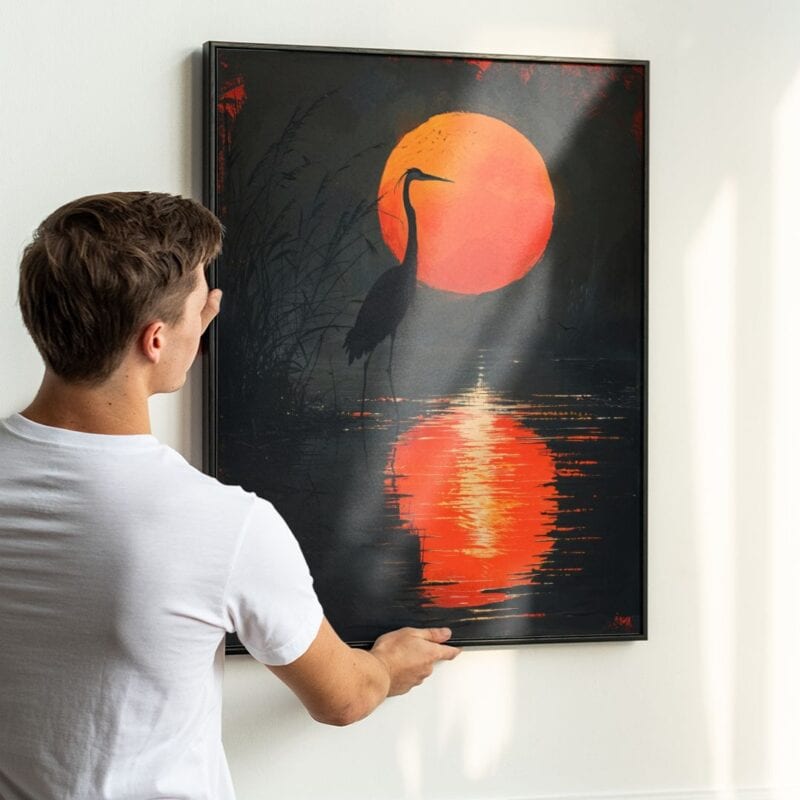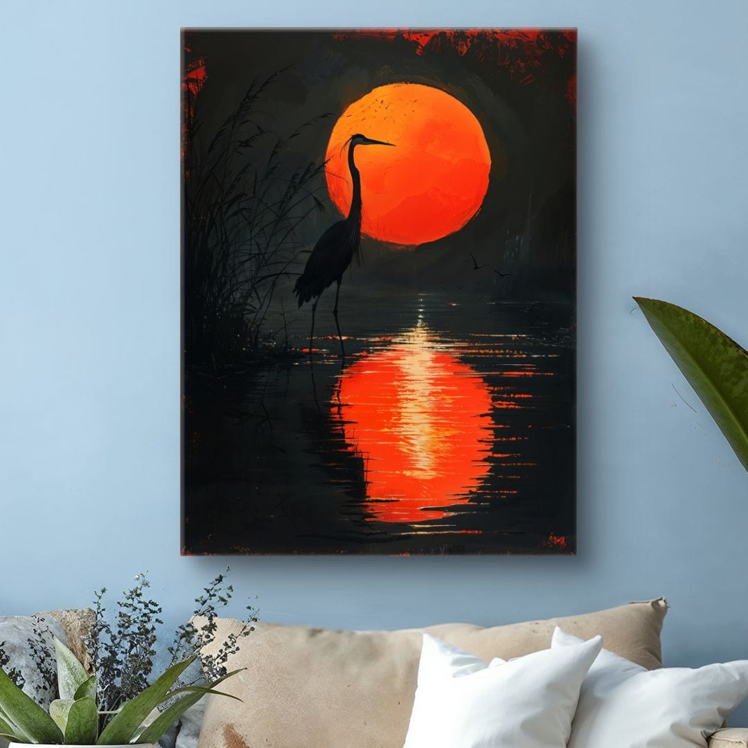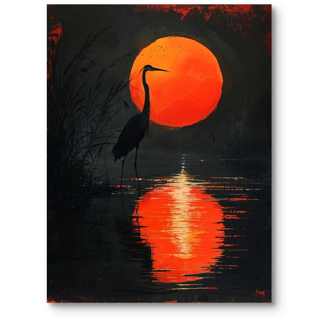 Obraz na płótnie ukazuje majestatyczną czaplę stojącą nad brzegiem spokojnego jeziora, otuloną świetlistą aurą intensywnie pomarańczowego zachodu słońca. Magiczne refleksy słońca odbijają się w wodzie, malując subtelne przejścia kolorów, a głębokie czernie i czerwienie nadają tej scenie dramatyzmu oraz niepowtarzalnej tajemniczości.