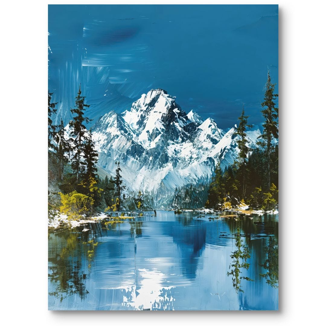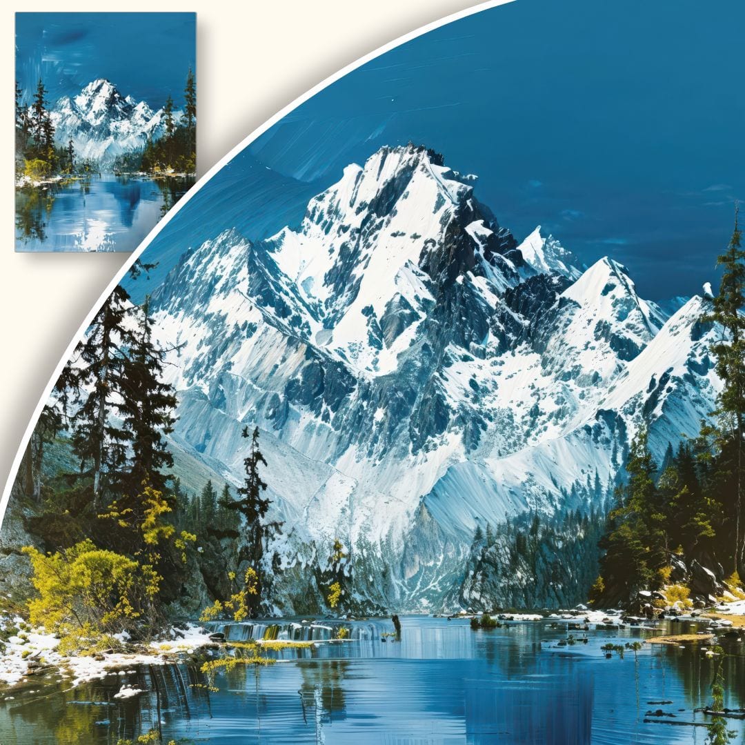Obraz na płótnie ukazuje majestatyczny krajobraz górski, w którym centralne miejsce zajmują ośnieżone, białe szczyty gór. W pierwszym planie, niczym zwierciadło, rozciąga się spokojne jezioro, odbijające zarówno błękit nieba, jak i surowy majestat górskich wierzchołków. Brzegi jeziora otulone są bujnym, soczyście zielonym lasem, budującym poczucie harmonii z dziką naturą.