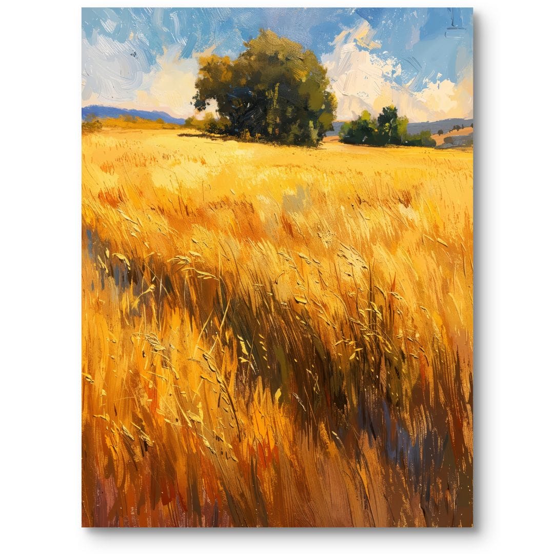 Centralnym elementem obrazu jest kontrast między złotymi tonami zbóż a chłodnym błękitem rozświetlonego słońcem nieba. Promienie światła subtelnie podkreślają strukturę zboża, wprowadzając do kompozycji ruch i naturalizm, a jednocześnie budując wyjątkową atmosferę spokoju.