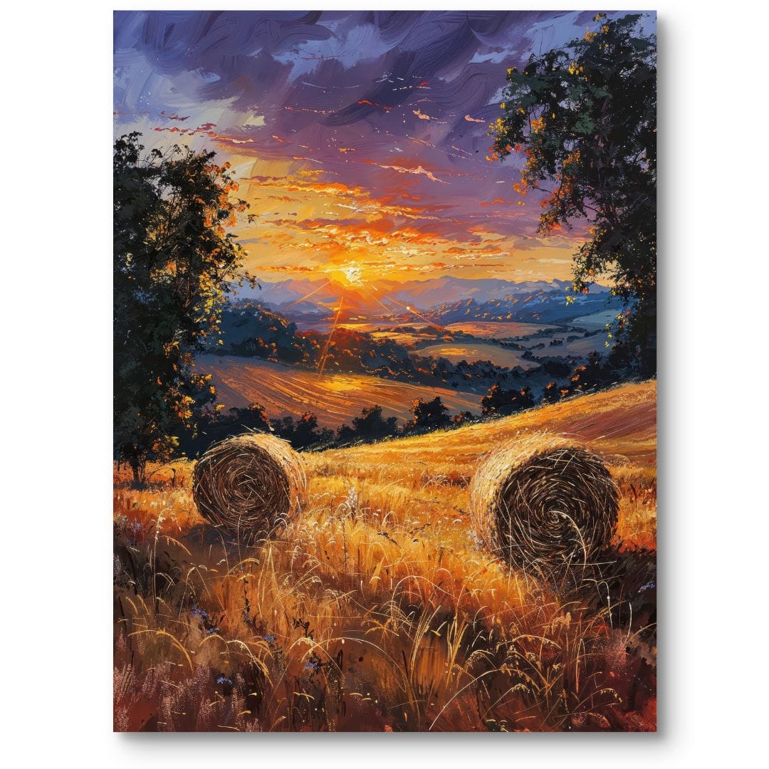 Obraz na płótnie ukazuje urokliwy, wiejski krajobraz podczas zachodu słońca, gdy niebo tonie w ciepłych odcieniach pomarańczy i subtelnego fioletu. Centralny punkt kompozycji stanowią dwa majestatyczne stogi siana na złocistym polu, otoczone delikatnie zieloną oprawą drzew i oddalonymi wzgórzami.