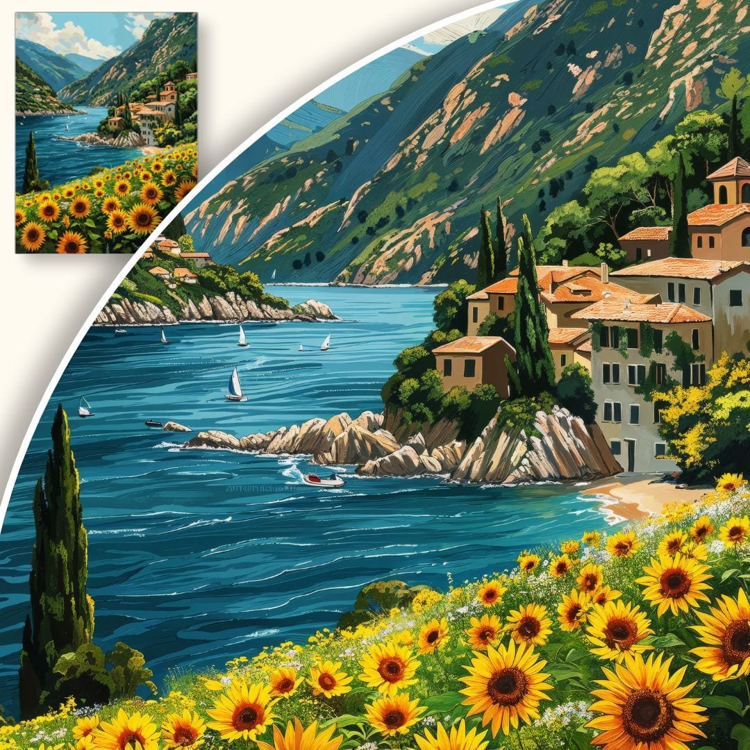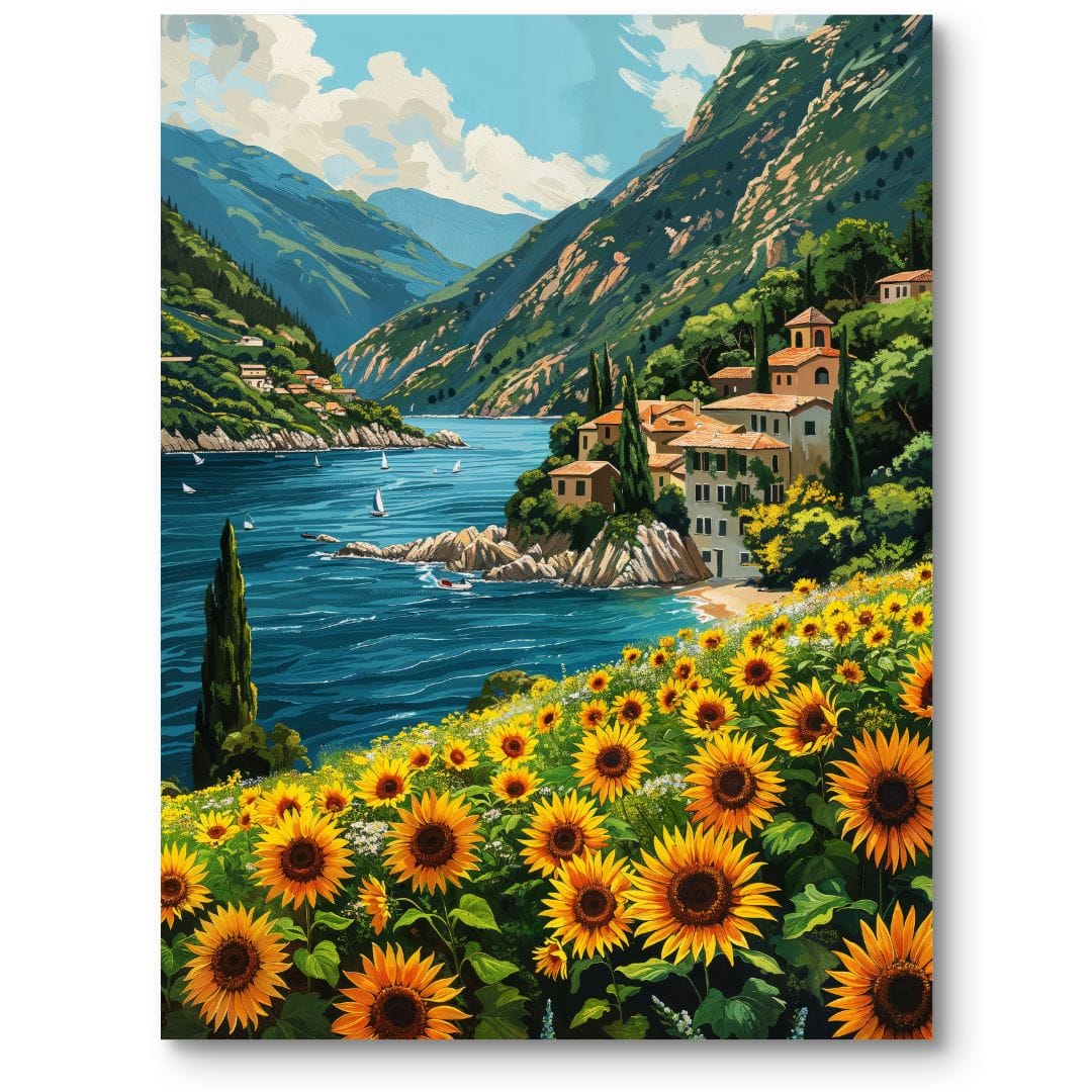 Obraz na płótnie ukazuje zachwycający pejzaż alpejski z malowniczym widokiem na majestatyczne góry i błękitne jezioro. Na pierwszym planie rozpościera się złociste pole słoneczników, którego intensywne barwy przyciągają wzrok i dodają kompozycji energii. W tle, na łagodnych wzgórzach, dostrzec można urokliwe, kameralne domki oraz rozświetlone, spokojne niebo z delikatnymi obłokami. Dzieło przenosi odbiorcę w sielskie, rozmarzone rejony włoskich Alp, wprowadzając atmosferę harmonii i beztroski.