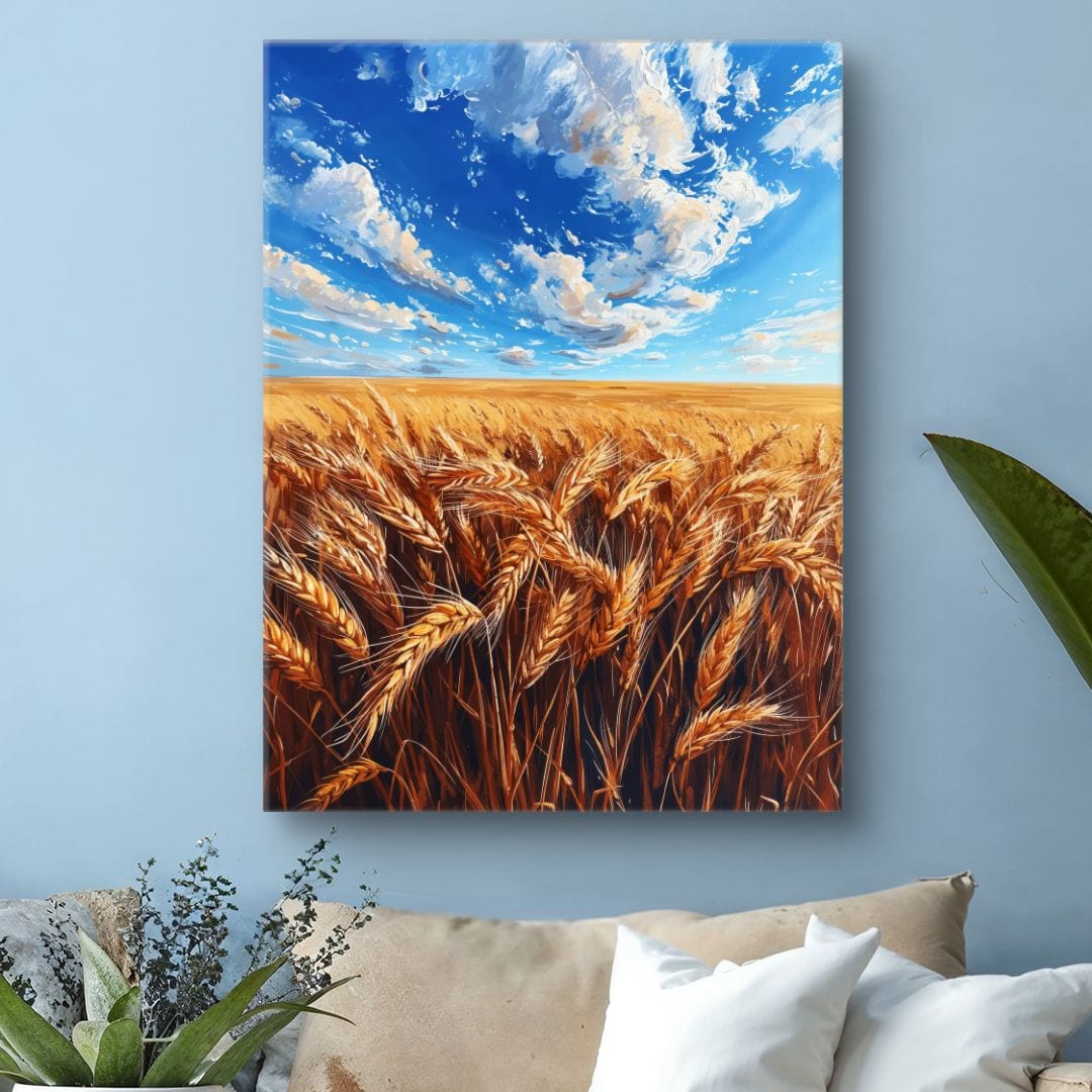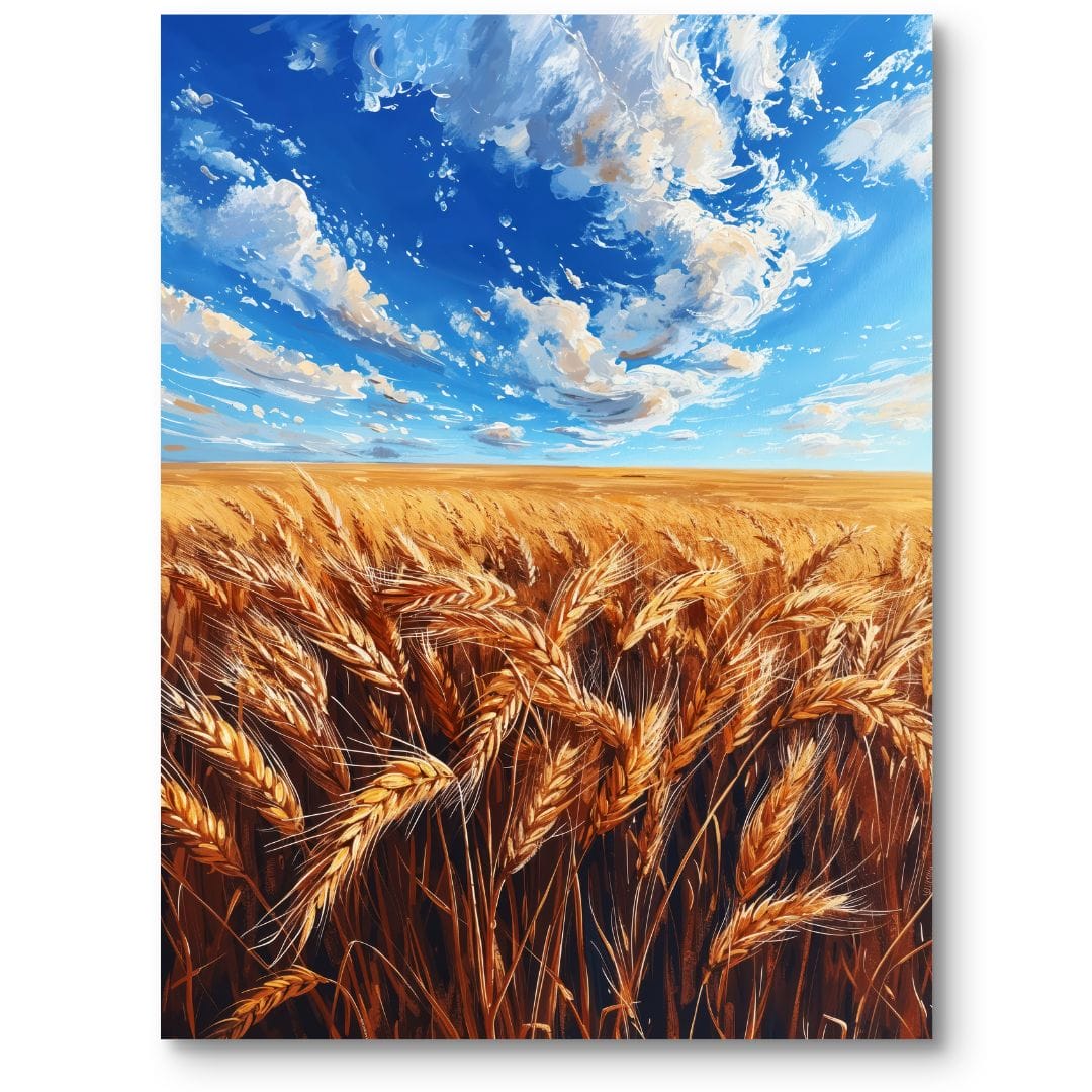 Obraz na płótnie ukazuje malowniczy pejzaż rolniczy – rozległe, złociste łany zbóż ciągną się aż po horyzont, okryte jasnobłękitnym niebem usianym białymi, puszystymi chmurami. To dzieło celebruje urok polskiej wsi, prezentując piękno natury oraz spokojny rytm codziennego życia na łonie przyrody.