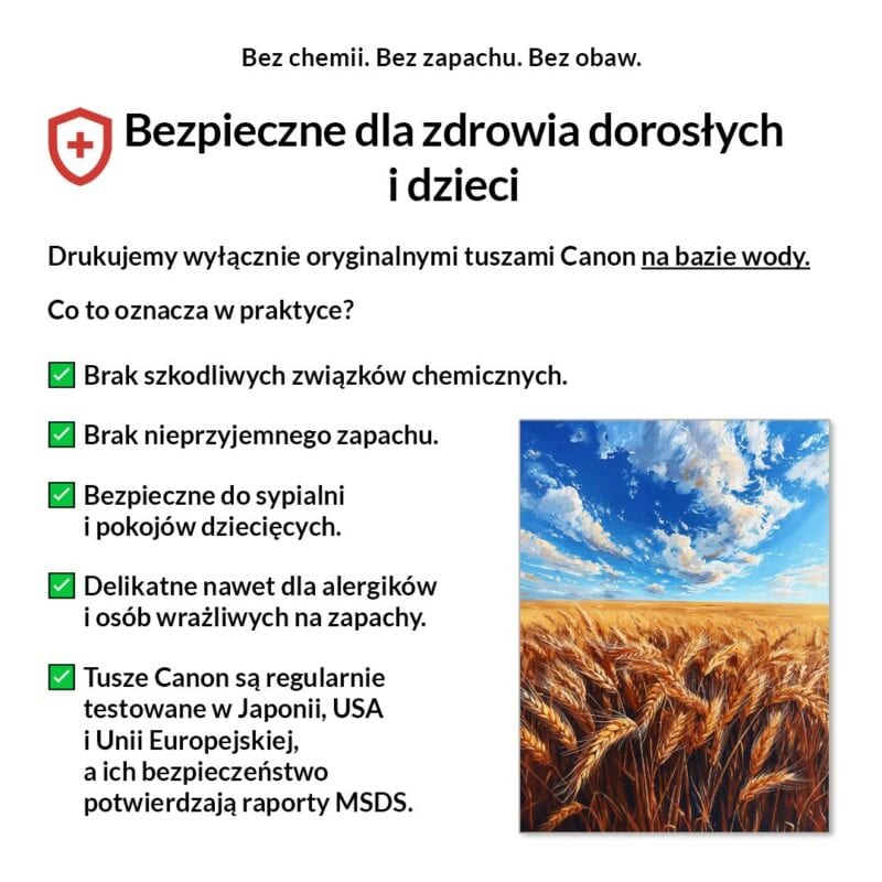 Tak, absolutnie! Drukujemy wyłącznie certyfikowanymi, bezwonnymi tuszami pigmentowymi Canon Lucia Pro na bazie wody. Są one w pełni bezpieczne dla zdrowia, nie zawierają rozpuszczalników i mogą być bez obaw stosowane w sypialniach i pokojach dziecięcych.