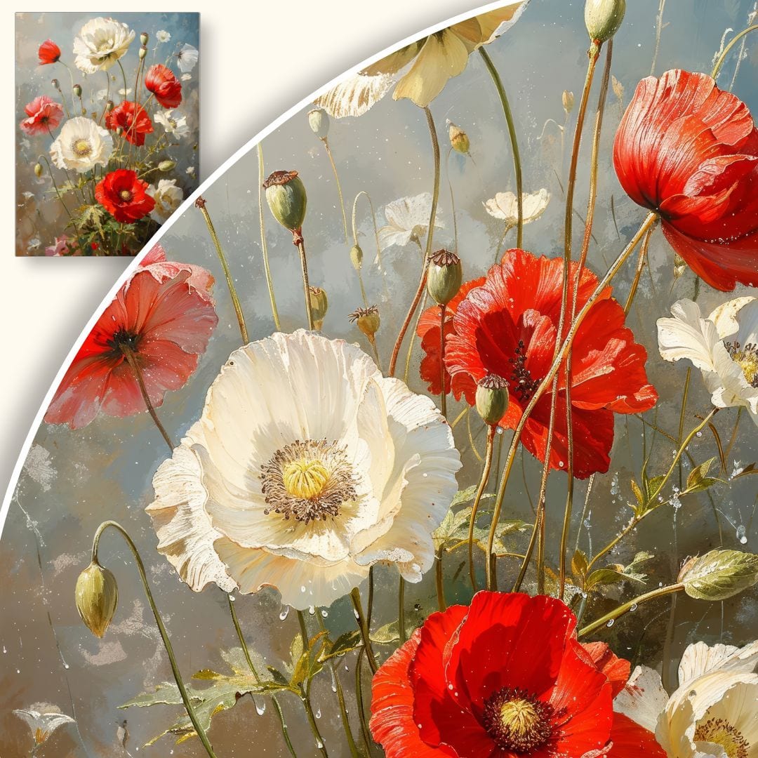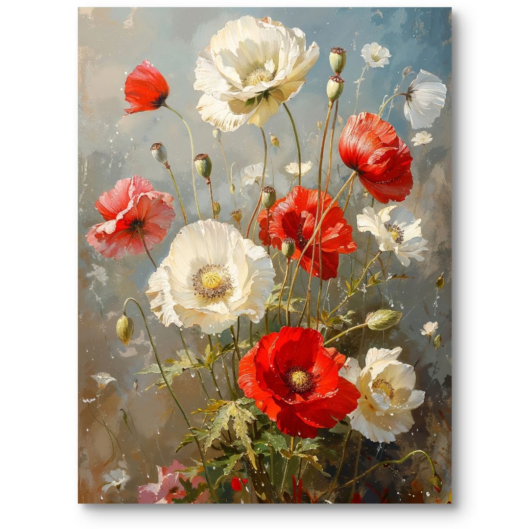 Sercem kompozycji są czerwone i białe maki, otulone subtelną zielenią liści. Żywe kolory i delikatne światło podkreślają naturalny wdzięk kwiatów, nadając scenie wrażenie świeżości i elegancji. Obraz tchnie spokojem, a zarazem przyciąga uwagę swoją energią barw.