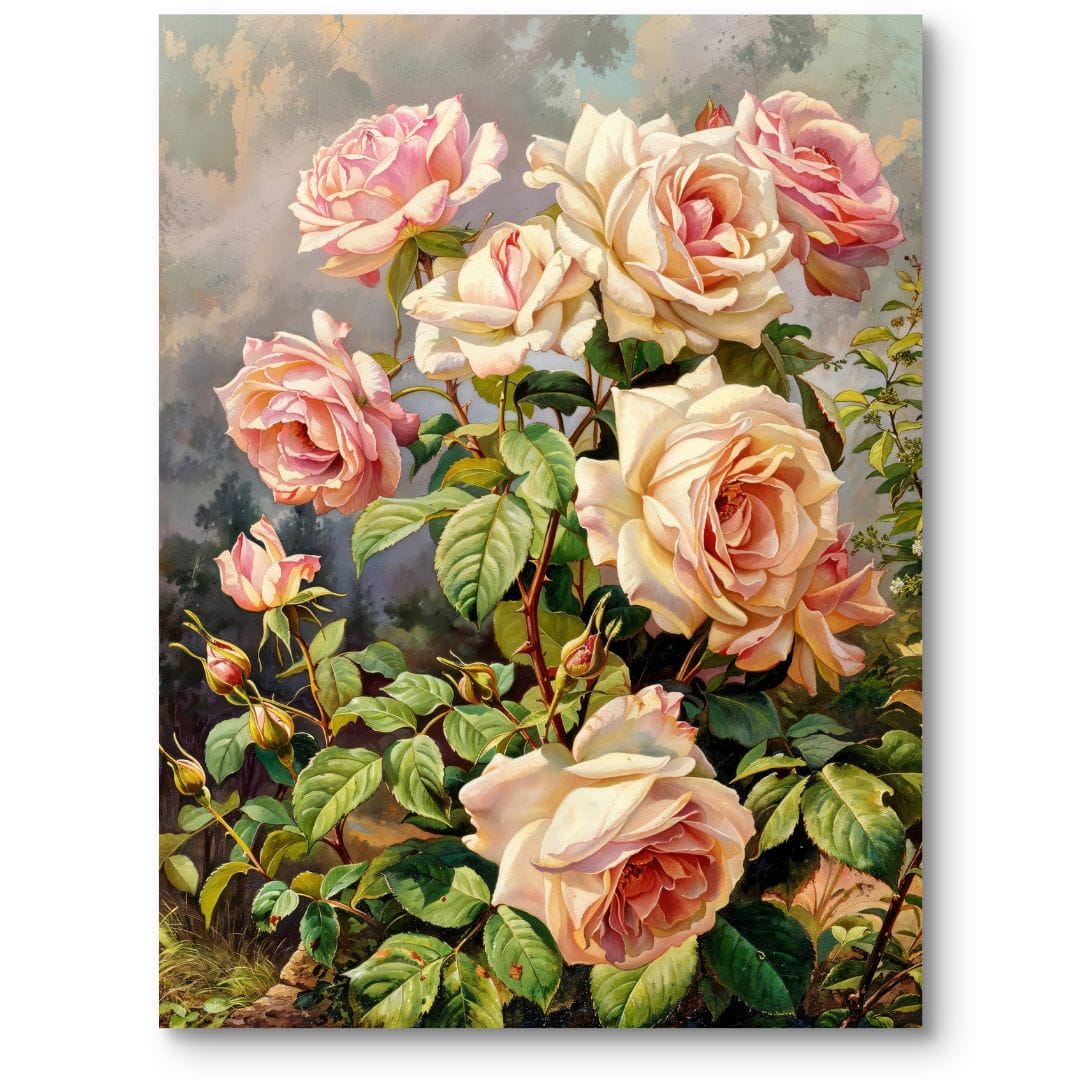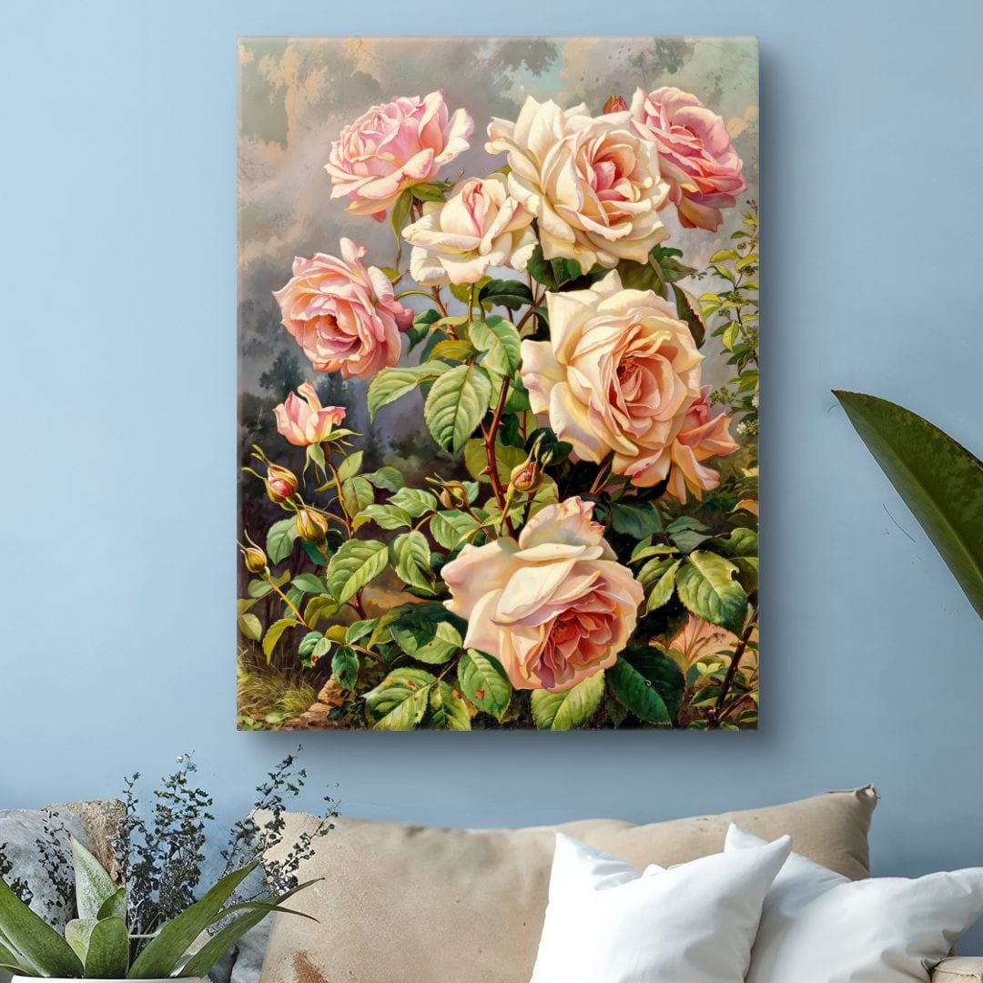 Obraz na płótnie prezentuje zjawiskowy bukiet róż rozkwitających w pełnej krasie. Centralnie umieszczone kwiaty przyciągają spojrzenie subtelną kompozycją płatków i liści, które otulają je z wdziękiem. Stonowane tło podkreśla naturalne piękno i bogactwo detali, pozwalając skupić uwagę wyłącznie na delikatności malowanych róż. Motyw ten, od wieków uosabiający miłość i urodę, wnosi do przestrzeni wyjątkową harmonię oraz ponadczasową elegancję.