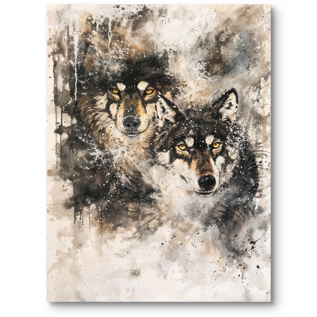 Obraz przedstawia dwa niezwykle realistycznie oddane wilki, zanurzone w malowniczym, naturalnym otoczeniu. Każdy detal sylwetek tych majestatycznych stworzeń został wiernie odwzorowany, co nadaje dziełu wyjątkowej głębi oraz autentyczności. To hołd dla siły natury i nieujarzmionego piękna dzikich zwierząt.