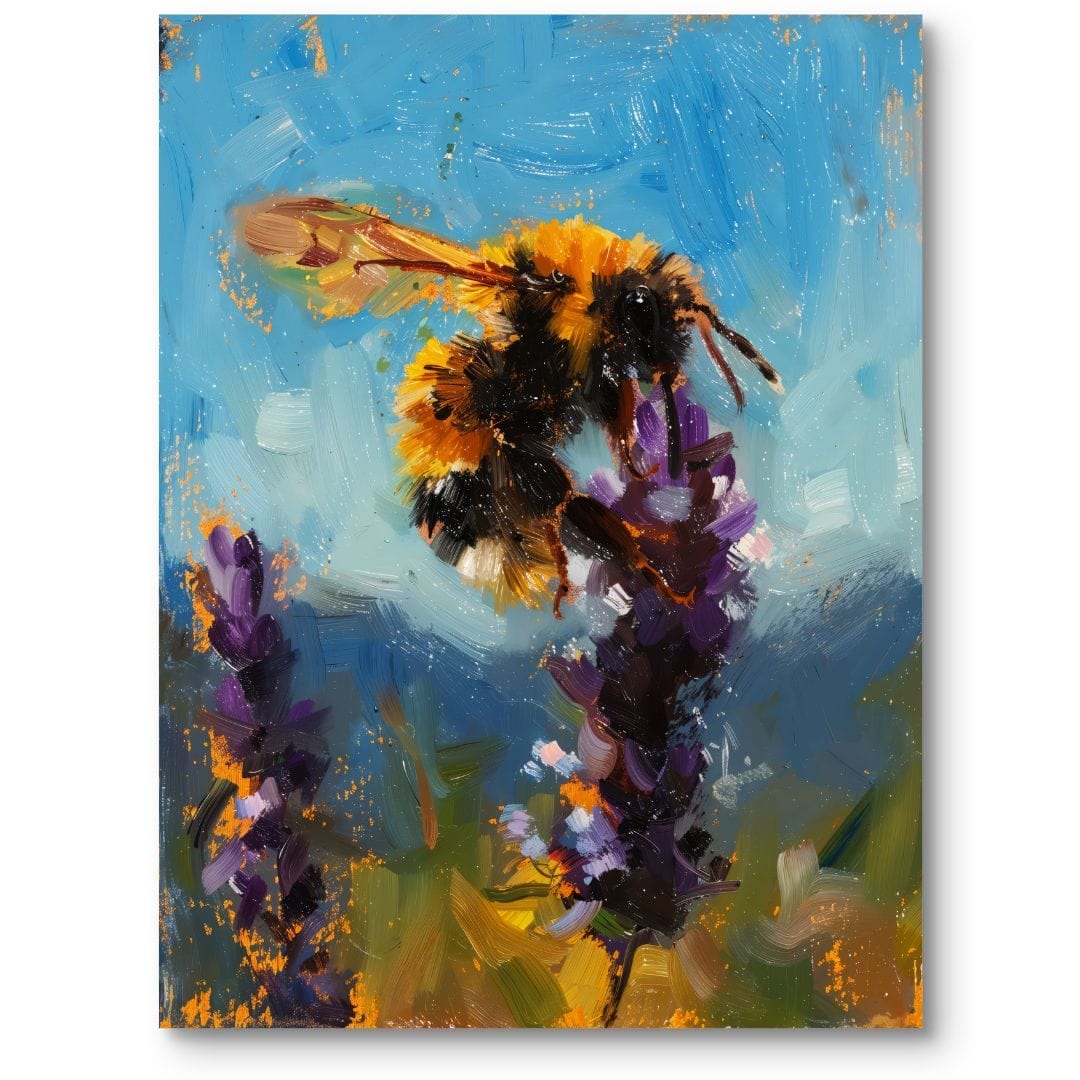 Obraz na płótnie przenosi nas w urokliwy świat przyrody – pszczoła przysiadająca na fioletowym kwiecie na tle błękitnego nieba staje się tu główną bohaterką. Artysta z wyjątkową wrażliwością uchwycił ulotny moment, celebrując piękno natury oraz kluczową rolę pszczół w ekosystemie.