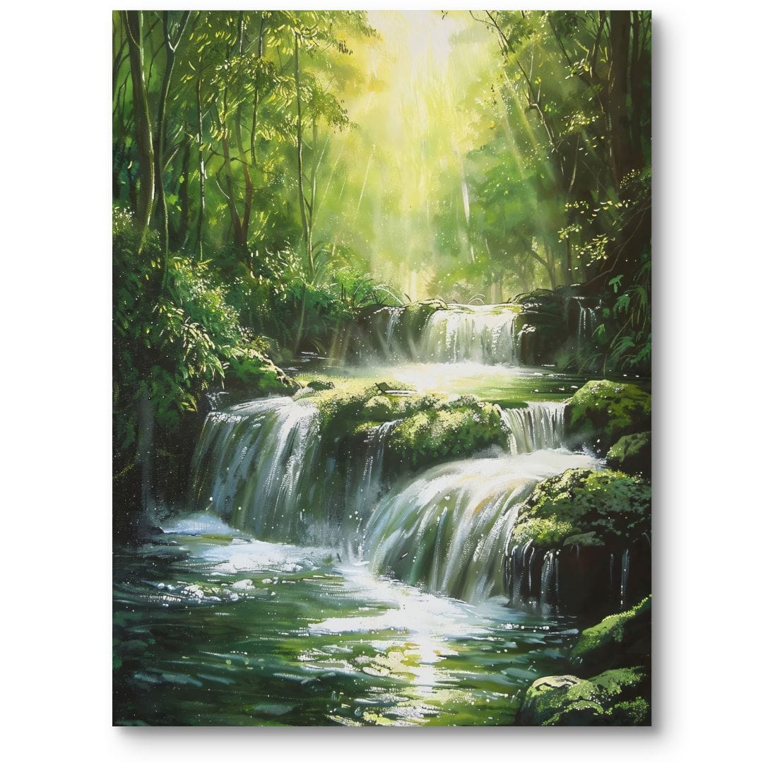 Przemyślana kompozycja prowadzi wzrok ku spadającej kaskadzie wody, wprowadzając do wnętrza dynamikę i świeżość. Dominujące tony zieleni i żółci potęgują wrażenie natury w rozkwicie, a przebłyski bieli i złocistego światła czynią całość doskonale zrównoważoną oraz przyjemną dla oka.