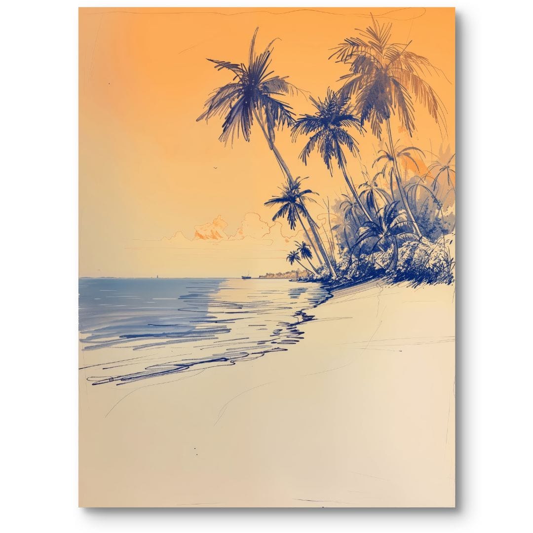 Obraz na płótnie ukazuje urokliwy zachód słońca nad plażą, którą zdobią majestatyczne palmy. Ciepłe, pomarańczowe odcienie nieba kontrastują harmonijnie z chłodnym błękitem morza, tworząc niezwykle malowniczą scenerię. Na piasku dostrzec można subtelne ślady fal, które dodają kompozycji naturalności i autentycznego uroku. Palmy namalowane z lekko impresjonistycznym zacięciem przyciągają uwagę i wprowadzają do obrazu romantyczną wizję tropikalnego raju.