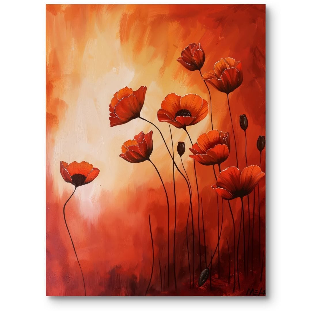 Obraz na płótnie przedstawia zachwycające, czerwone maki skąpane w ciepłych, pomarańczowych tonach. Kwiaty w różnych stadiach rozkwitu nadają kompozycji energii, naturalnej dynamiki i niepowtarzalnego życia. Dominująca czerwień w połączeniu z subtelnymi odcieniami pomarańczu tworzy pogodny i pełen optymizmu klimat, który rozjaśni każde wnętrze.