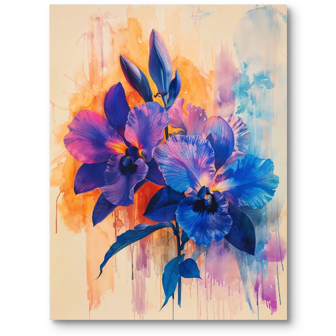 Obraz na płótnie ukazuje zjawiskowe kwiaty orchidei, rozkwitające w intensywnych barwach niebieskiego, pomarańczowego i fioletowego. Centralnie umieszczone kwiaty przyciągają wzrok wyrazistą kolorystyką i precyzyjnym detalem. Swobodna dynamika kompozycji podkreśla piękno natury w jej najbardziej wytwornej i eleganckiej odsłonie.