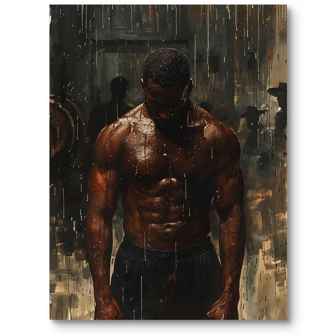 Obraz na płótnie ukazuje dynamiczną sylwetkę muskularnego mężczyzny, stojącego w strugach deszczu. Realistycznie przedstawiona postać wyłania się na tle pełnym dramatyzmu i emocji, podkreślając tematy siły, niesłabnącej motywacji oraz determinacji. Dzięki niezwykłemu przekazowi ten obraz stanowi motywujące dzieło dla osób żyjących aktywnie i pasjonujących się sportem.