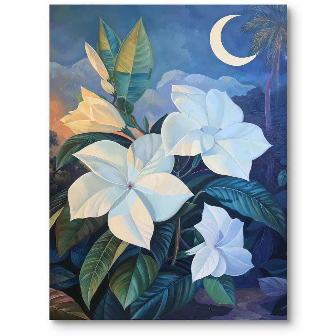 Ten obraz na płótnie ukazuje pełną spokoju, nocną scenę z efektownymi, białymi kwiatami w centrum uwagi. Delikatnie rozświetlone przez blask księżyca tropikalne liście tworzą romantyczne i nastrojowe tło, łącząc harmonię natury z urzekającą aurą nocnego pejzażu. Przemyślana kompozycja z wyrazistą grą światła podkreśla piękno przyrody i przyciąga wzrok, wprowadzając do wnętrza nutę relaksu i subtelnej elegancji.