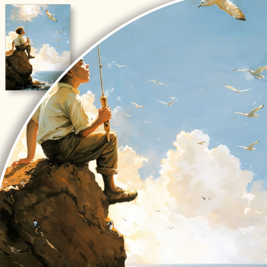 Obraz na płótnie ukazuje młodego chłopca siedzącego na skale u brzegu morza, zatopionego w chwilę podczas wędkowania. To niezwykle malowniczy motyw – wokół fruwają mewy, zaś na horyzoncie rozciąga się spokojne, błękitne morze i miękkie, białe chmury skąpane w promieniach słońca. Scena ta oddaje piękno natury, swobodę oraz radosnego ducha dziecięcych przygód nad wodą.