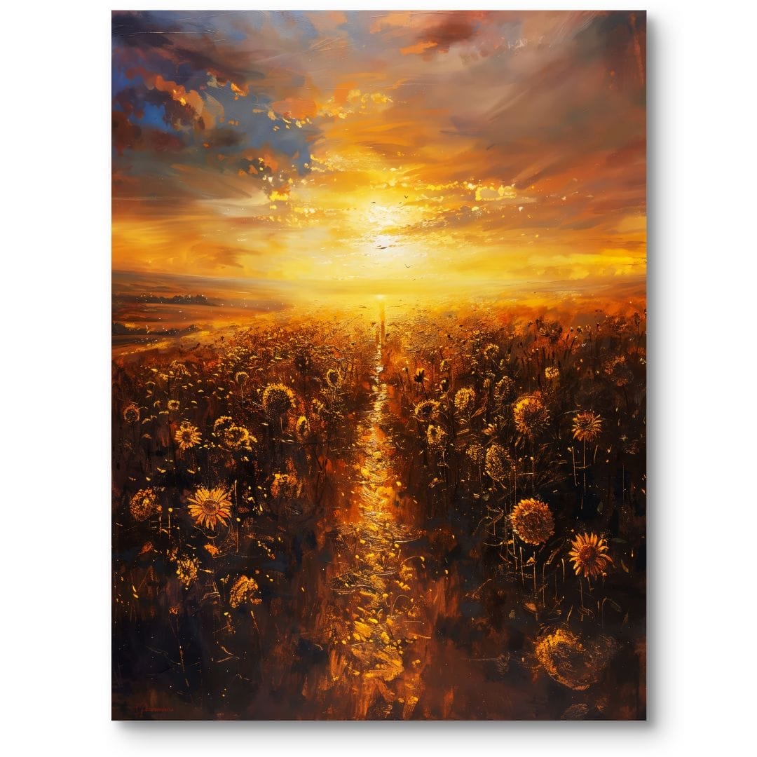Obraz na płótnie prezentuje urzekający krajobraz rozświetlonego zachodem słońca pola słoneczników. W ciepłym blasku złota i głębokich pomarańczy całość nabiera bajkowego, niemal magicznego wymiaru. Wiodąca przez pole droga prowadzi wzrok ku horyzontowi, dodając kompozycji głębi i dynamiki. Intensywne barwy zachodu emanują optymizmem, budząc pozytywną energię i radość życia.