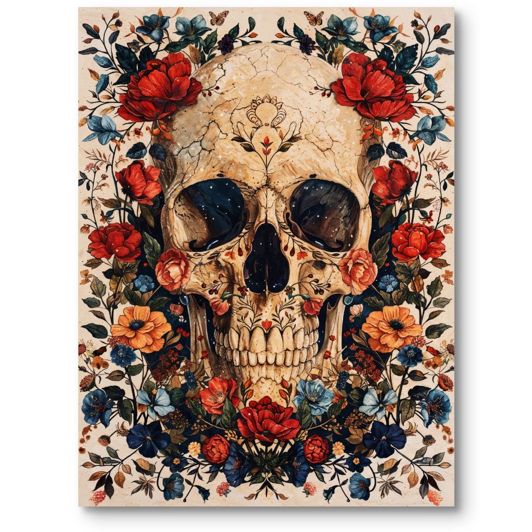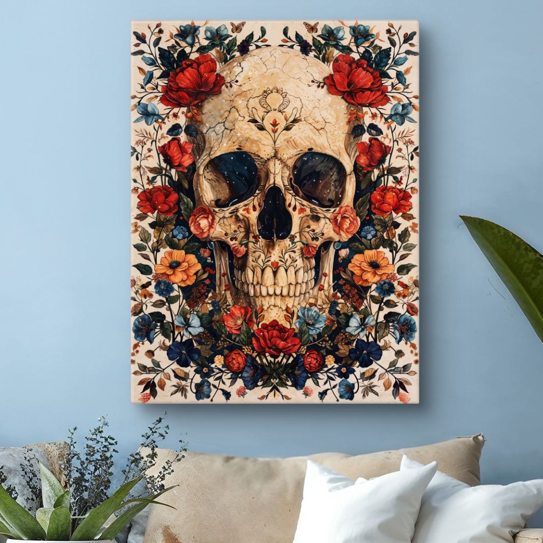 Centralnie umieszczona czaszka, otulona feerią kolorowych kwiatów, przyciąga spojrzenie i nadaje całości wyrazisty, artystyczny rytm. Ciepłe tony beżu doskonale podkreślają kontrapunkty soczystych czerwieni, żółci i błękitów. Dopracowana gra światła i cieni wzmacnia trójwymiarowy efekt, dodając obrazowi niepowtarzalnej głębi.