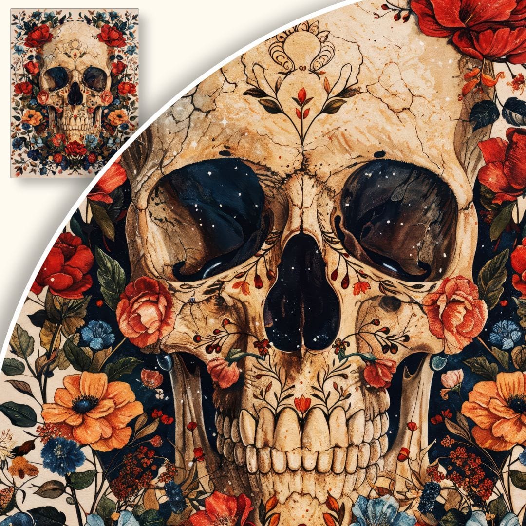 Motyw czaszki w otoczeniu kwiatów to klasyczne nawiązanie do tradycji malarstwa vanitas, które swoje korzenie czerpie z XVII-wiecznej sztuki niderlandzkiej. Takie przedstawienia miały przypominać odbiorcom o przemijaniu, umiejętności dostrzegania piękna chwili i refleksji nad wartościami życia. Współcześnie podobne kompozycje chętnie wykorzystują artyści, tacy jak Damien Hirst czy Philippe Pasqua, reinterpretując klasyczny symbol w nowoczesnym wydaniu.