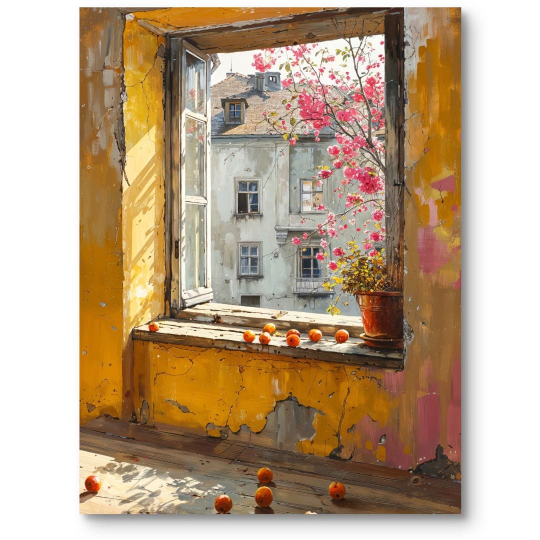 Obraz na płótnie ukazuje malowniczy widok z uchylonego okna na ciepło otulony krajobraz miejski. W centrum kompozycji znajduje się otwarte okno, przez które można podziwiać zabytkową kamienicę oraz rozkwitające drzewa w tle. Parapet i podłoga ozdobione zostały pomarańczami, wnętrze zyskuje więc wyjątkowy, naturalny akcent, kontrastujący z tłem miejskiego pejzażu. Cała scena emanuje spokojem i aurą domowego ciepła.