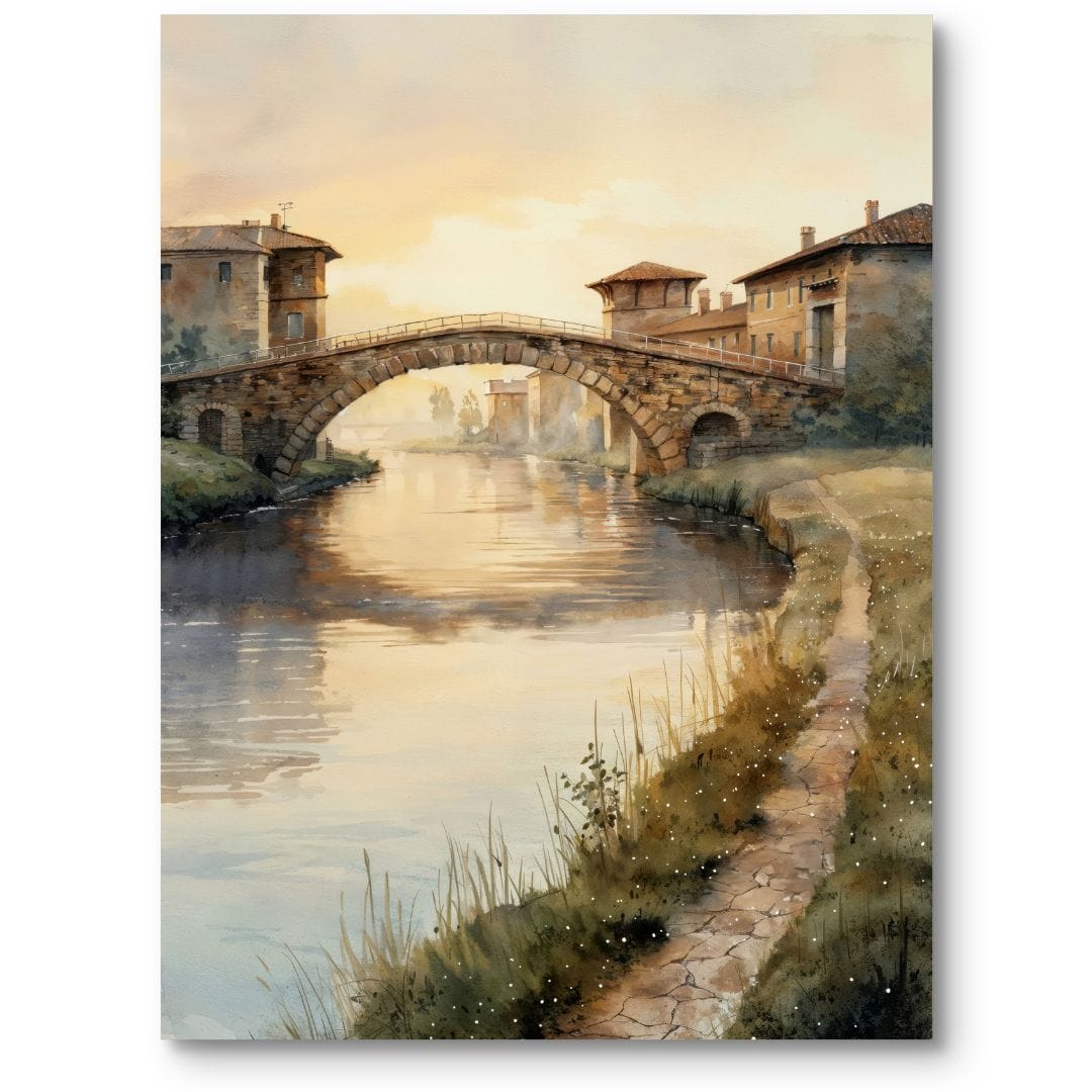 Prezentowany obraz na płótnie ukazuje urokliwy, spokojny krajobraz z zabytkowym, kamiennym mostem przerzuconym nad leniwie płynącą rzeką. W tle majaczą klimatyczne budynki, przypominające romantyczną wioskę – niewielkie domy i kamieniczki roztaczają aurę ponadczasowego spokoju. Starannie namalowane łuki mostu podkreślają jego historyczny charakter, a tafla rzeki malowniczo odbija ciepłe promienie zachodzącego słońca, rozświetlając całe przedstawienie niezwykłym blaskiem.