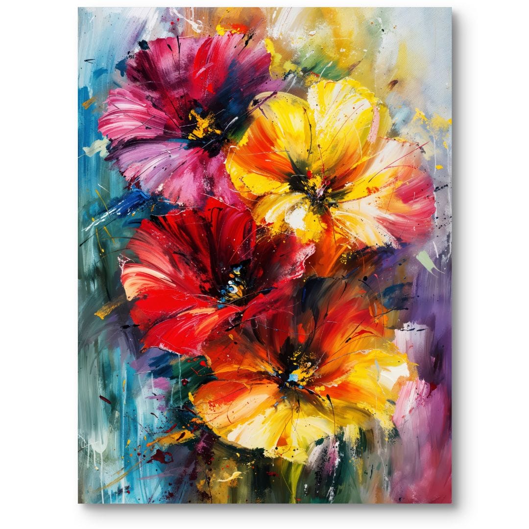 Obraz na płótnie ukazuje barwne, rozkwitające kwiaty w oryginalnej, abstrakcyjnej interpretacji. Dominujące kolory – żółcie, czerwienie i fiolety – przenikają się w harmonijny sposób, tworząc ciepłą i pełną energii kompozycję. Dynamiczna ekspresja ruchu nadaje kwiatom życie, odzwierciedlając ich naturalny rozkwit i spontaniczność natury.
