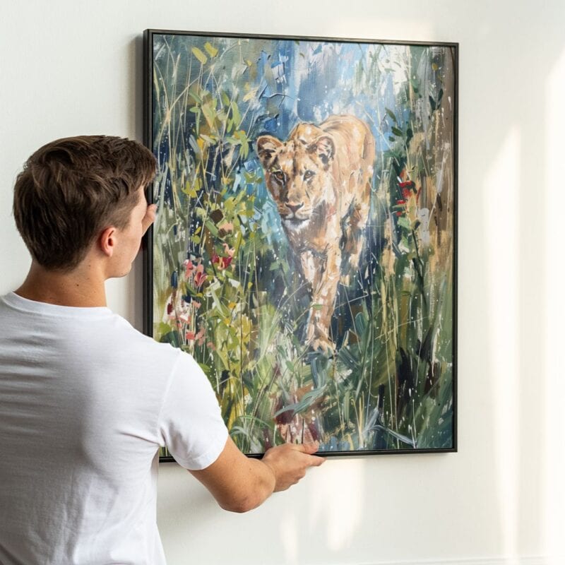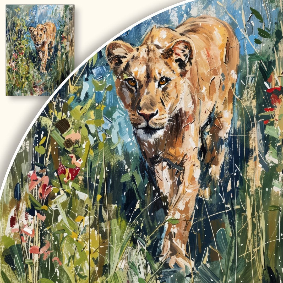 Obraz na płótnie przedstawia majestatycznego lwa dumnie kroczącego przez gęsty, zielony krajobraz. Bujna roślinność oplatająca zwierzę dodaje dynamiki i głębi całej kompozycji, podkreślając dzikość oraz nieokiełznane piękno przyrody. Artysta uchwycił potęgę natury i niepowtarzalny urok świata zwierząt w jednym, niezwykle ekspresyjnym kadrze.