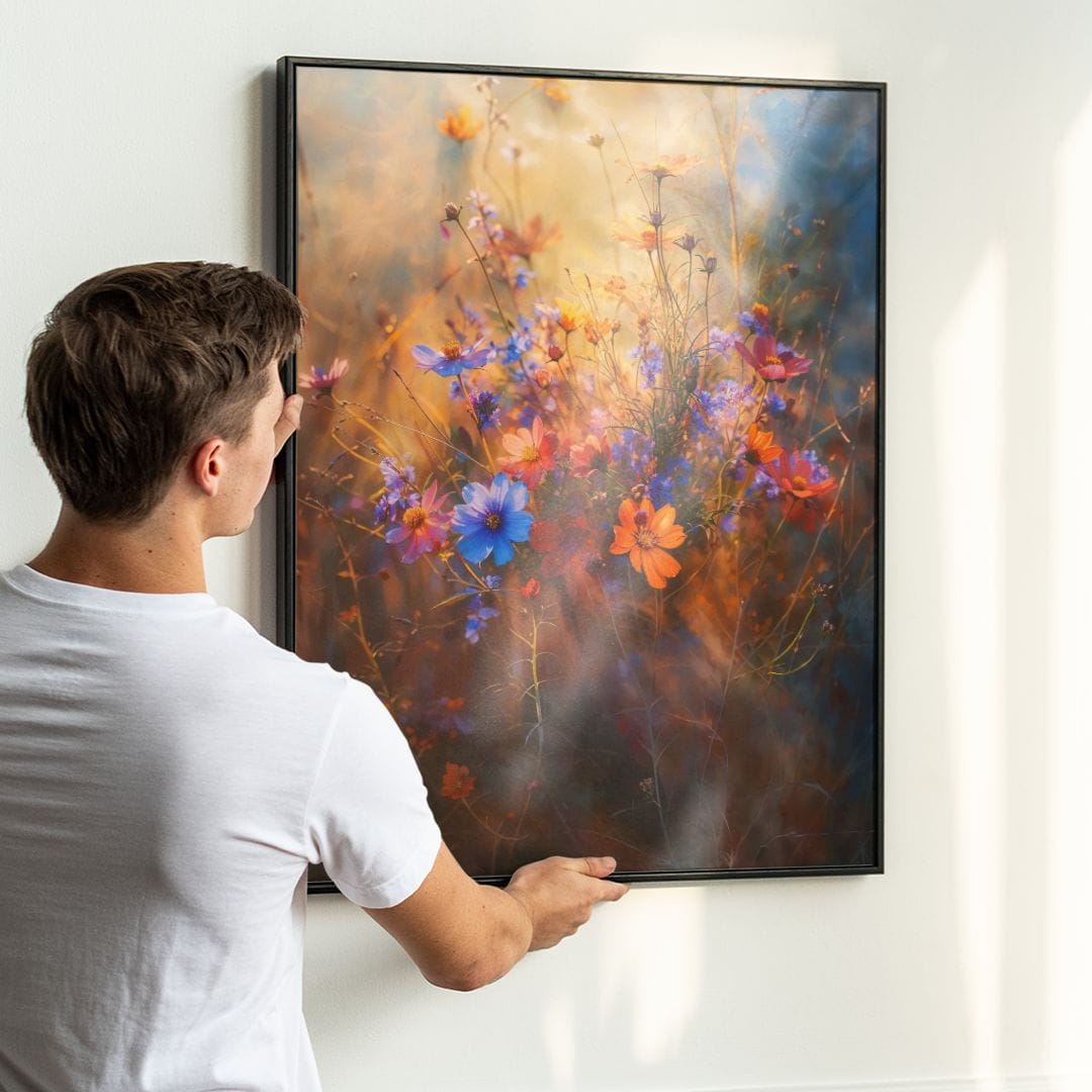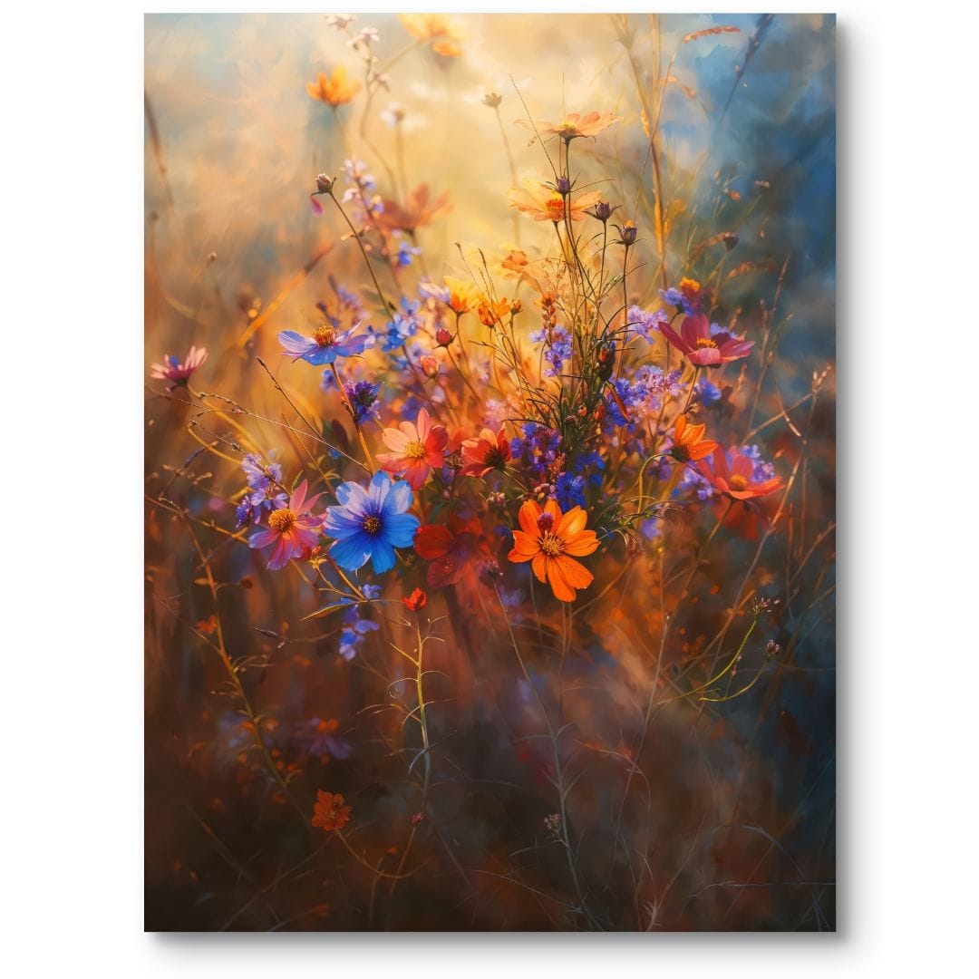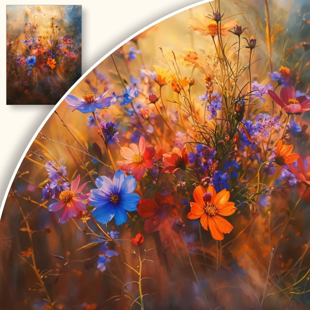 Obraz na płótnie przedstawia okazały bukiet polnych kwiatów zatopiony w naturalnym krajobrazie. Artysta mistrzowsko uchwycił różnorodność gatunków i intensywność barw – płomienną pomarańcz, głęboki błękit oraz żywą czerwień. Miękko rozmyte tło uwypukla bogactwo i szczegółowość roślin, przenosząc widza na rozkwitającą łąkę, gdzie natura celebruje pełnię swojego piękna.