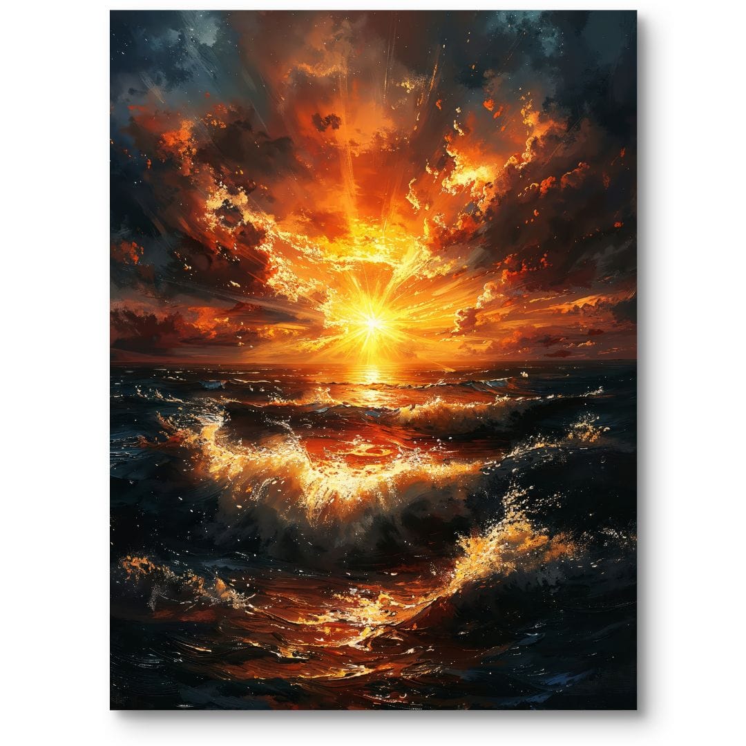 Ten obraz na płótnie przenosi widza w niezwykły świat morskiego pejzażu podczas hipnotyzującego zachodu słońca. Soczyste promienie w odcieniach pomarańczowego i złota przebijają się przez gęste, dramatyczne chmury, rozświetlając fale rozbijające się z energią o siebie. Subtelne, ale dynamiczne przedstawienie przyciąga uwagę do potęgi i majestatu natury, zapraszając do głębszej kontemplacji jej zmienności i piękna.