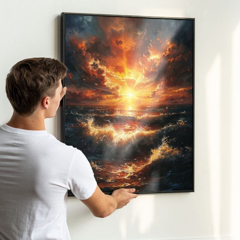 Obraz emanuje nieskończoną energią, tętni życiem i ruchem. Przechodzące w siebie barwy i dynamiczne fale obrazują zmagania pogody i morza – symbolizując zarówno siłę natury, jak i jej nieprzewidywalność. Zachód słońca niesie ze sobą przesłanie nadziei, wyciszenia i nowych początków, sprawiając, że obraz staje się nie tylko dekoracją, ale też inspiracją.
