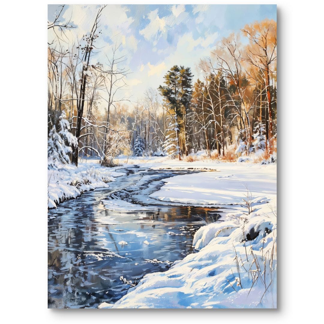 Obraz na płótnie prezentuje malowniczy zimowy krajobraz z rzeką wijącą się przez śnieżne pola. Z jednej strony towarzyszą jej smukłe, nagie drzewa oraz zamarznięty las, a tafla lodowej wody odbija błękit nieba. Cała scena emanuje spokojem i relaksem, przenosząc widza w świat ciszy oraz naturalnego piękna. Detale – mieniący się śnieg, refleksy na wodzie, faktura kory drzew – zostały oddane z ogromną precyzją, dając poczucie obecności w samym sercu zimowej natury.