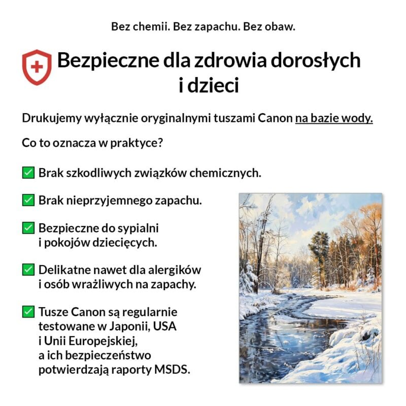 Tak, absolutnie! Drukujemy wyłącznie certyfikowanymi, bezwonnymi tuszami pigmentowymi Canon Lucia Pro na bazie wody. Są one w pełni bezpieczne dla zdrowia, nie zawierają rozpuszczalników i mogą być bez obaw stosowane w sypialniach i pokojach dziecięcych.