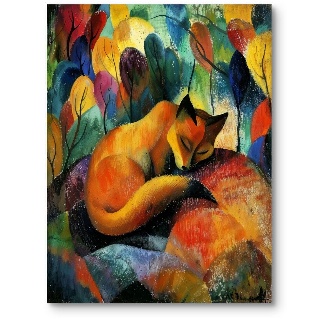 Obraz na płótnie ukazuje senną esencję natury – śpiącego lisa, otoczonego feerią barwnych liści. Starannie dobrana kolorystyka i subtelne formy wprowadzają widza w stan wyciszenia, oddając magię jesiennej aury oraz czystą harmonię przyrody.