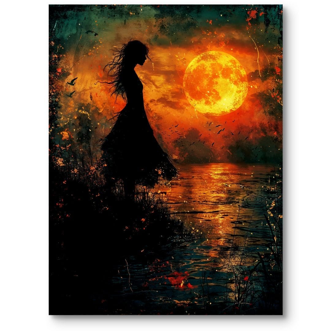 Mroczny, tajemniczy nastrój płótna zachęca do głębokiej refleksji. Kobieta zwrócona ku zachodzącemu słońcu symbolizuje tęsknotę, przemianę, zamyślenie nad mijającymi etapami życia. Zmysłowa, mistyczna aura całości podkreślona jest przez świetlistą poświatę przypominającą księżycową noc.