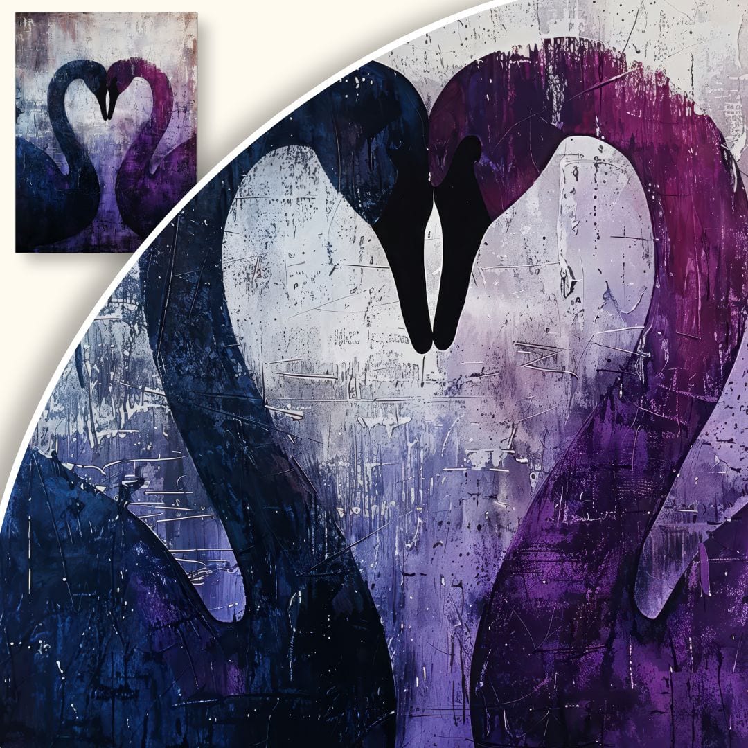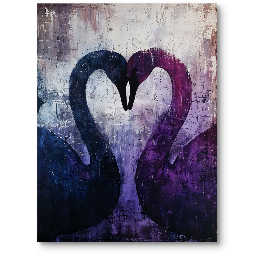 Obraz na płótnie przedstawia dwa łabędzie subtelnie splecione w kształt serca, będące ponadczasowym symbolem miłości i nierozerwalnej jedności. Ich harmoniczne sylwetki przenikają się wzajemnie, ukazując delikatność, bliskość oraz elegancję tych niezwykłych ptaków.