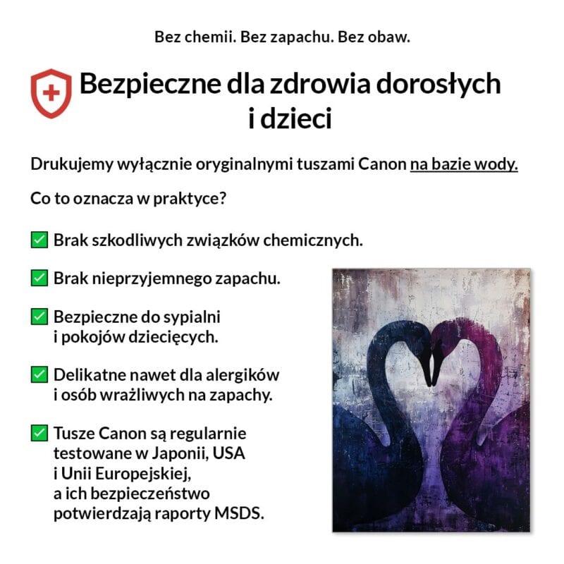 Tak, absolutnie! Drukujemy wyłącznie certyfikowanymi, bezwonnymi tuszami pigmentowymi Canon Lucia Pro na bazie wody. Są one w pełni bezpieczne dla zdrowia, nie zawierają rozpuszczalników i mogą być bez obaw stosowane w sypialniach i pokojach dziecięcych.
