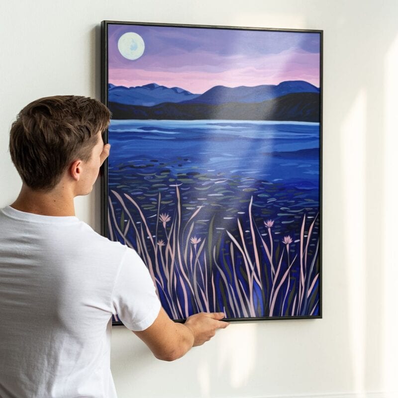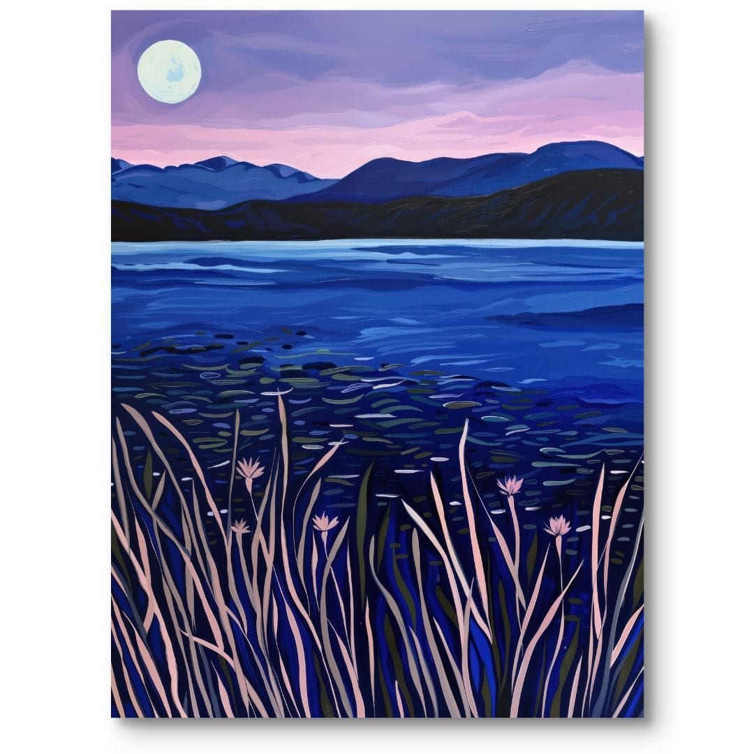 Obraz odznacza się harmonijną, przemyślaną kompozycją z głębokim, niebieskim jeziorem na pierwszym planie i nastrojowymi, fioletowymi górami w tle. Centralne miejsce zajmuje świetlisty księżyc, który otula całą scenę delikatnym, chłodnym światłem. Dominujące barwy – niebieskości, fiolety i zielenie – tworzą wyrazisty kontrast pomiędzy taflą wody a granatowym niebem.
