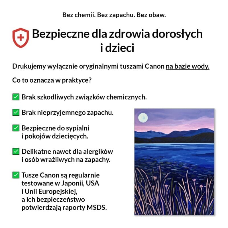 Tak, absolutnie! Drukujemy wyłącznie certyfikowanymi, bezwonnymi tuszami pigmentowymi Canon Lucia Pro na bazie wody. Są one w pełni bezpieczne dla zdrowia, nie zawierają rozpuszczalników i mogą być bez obaw stosowane w sypialniach i pokojach dziecięcych.