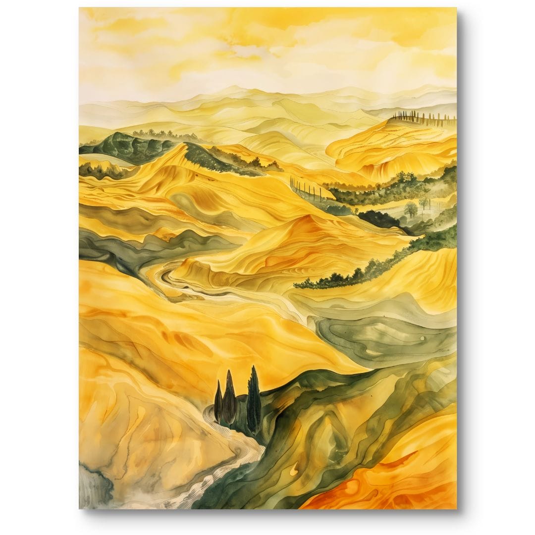 Kompozycja emanuje energią i ruchem, dzięki harmonijnie poprowadzonym wzgórzom i wijącej się drodze, która wciąga spojrzenie w głąb obrazu. Światło odgrywa tu kluczową rolę, subtelnie muskając złociste łąki, by zaoferować widzowi poczucie ciepła i bezpieczeństwa. Paleta barw oscyluje wokół odcieni żółci, pomarańczy oraz łagodnej zieleni, podkreślając letni, przytulny klimat.