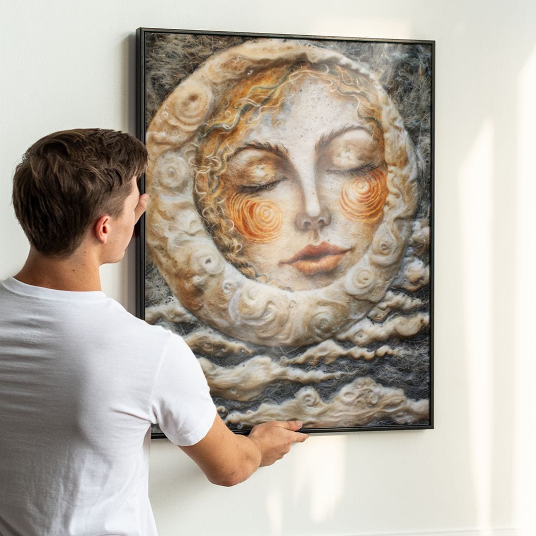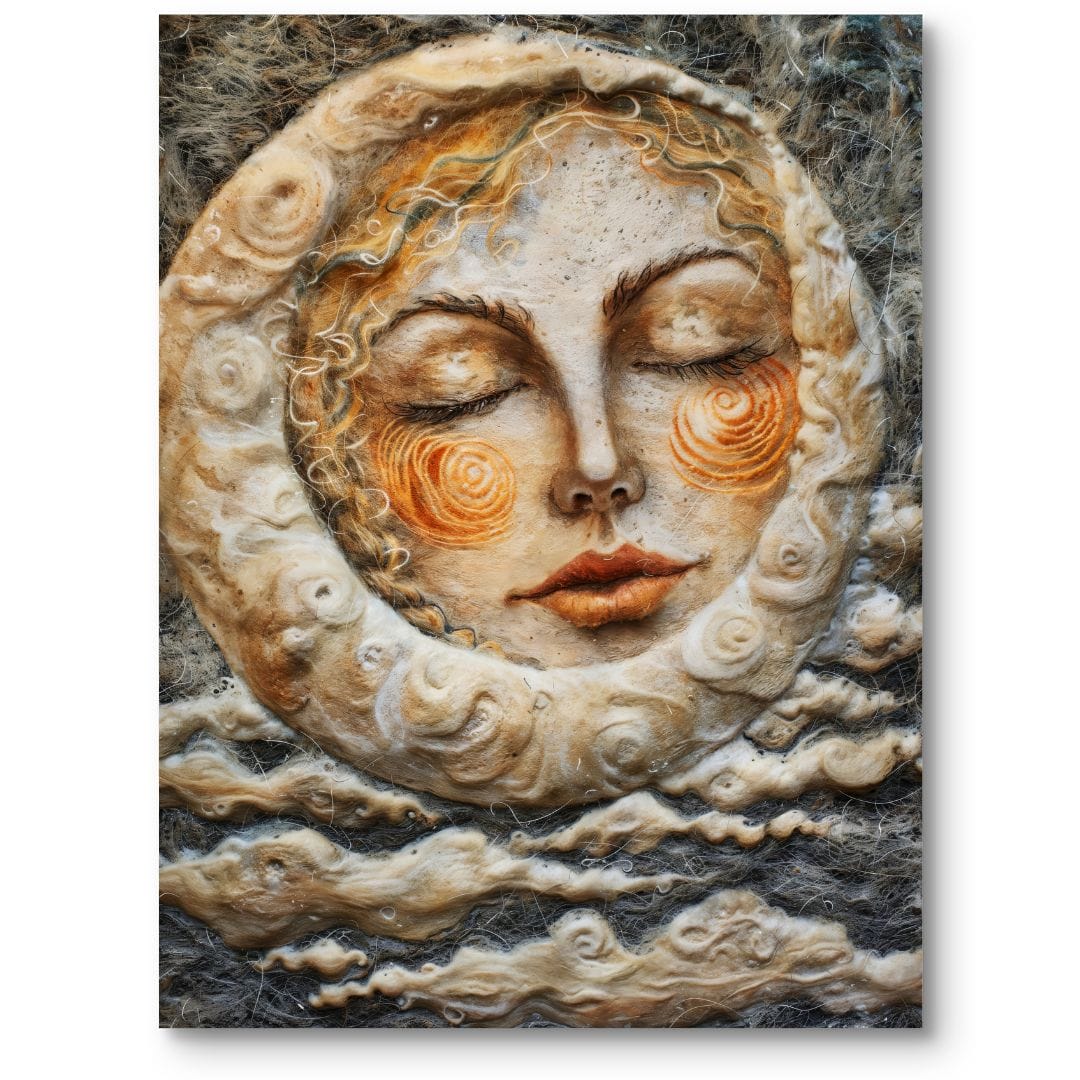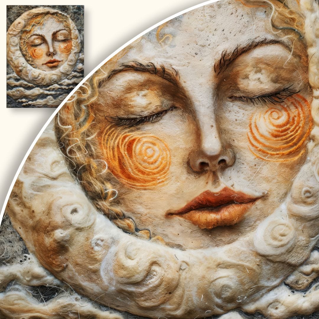 Obraz w subtelny sposób ukazuje spokojną twarz kobiety wpisaną w kształt półksiężyca, unoszącą się delikatnie pośród eterycznych chmur. Spokojne rysy i łagodny wyraz twarzy wzbogacone są o ciepłe odcienie beżu i pomarańczy, tworząc atmosferę ciepła i ukojenia. Dzieło spaja ze sobą elementy ziemskie i niebiańskie, przenosząc widza w świat marzeń i wyobraźni.