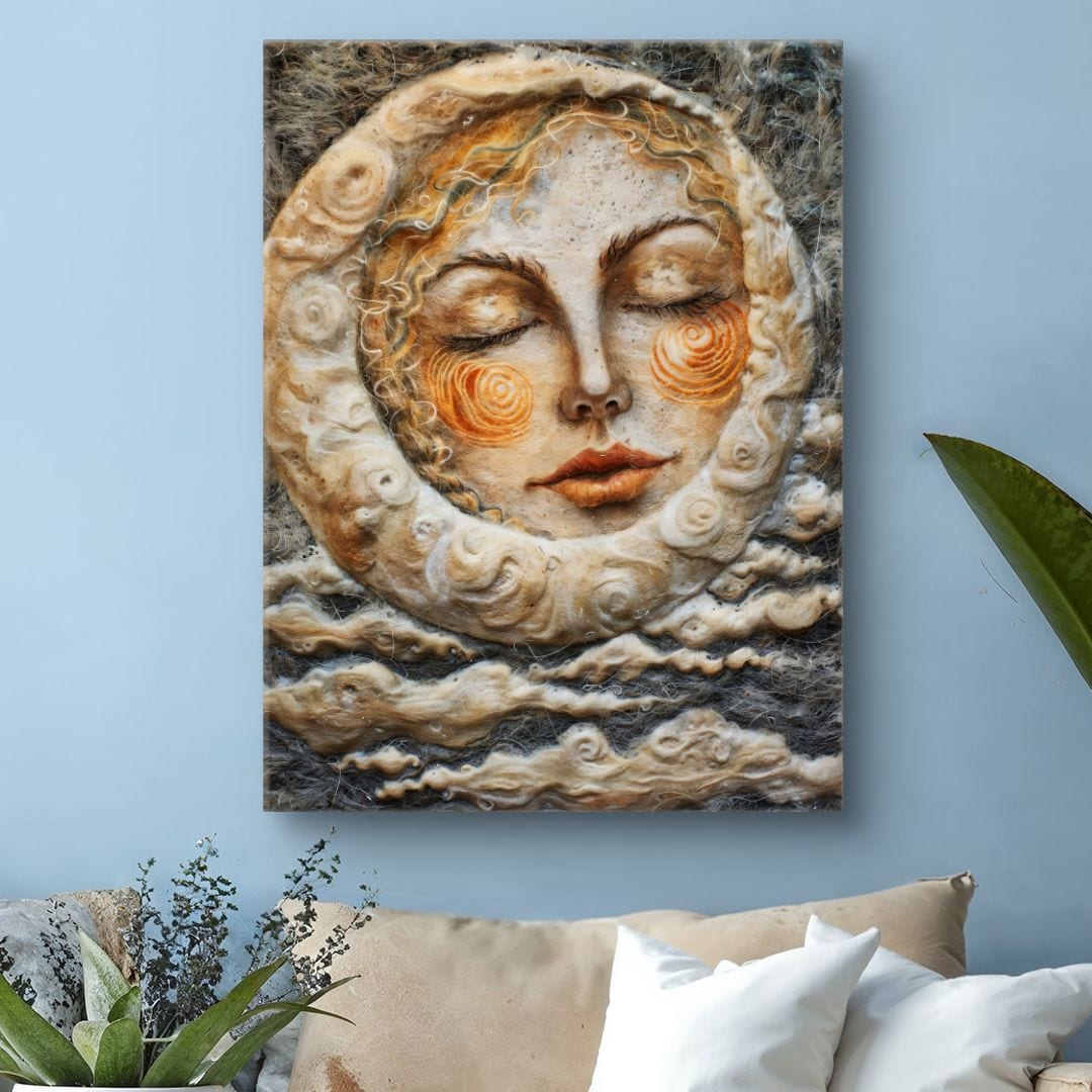 Obraz przykuwa uwagę aurą spokoju i relaksu. Symbolika półksiężyca oraz chmur nawiązuje do nocnych marzeń i świata refleksji, a kobieca twarz w centrum to metafora wewnętrznej równowagi oraz harmonii.