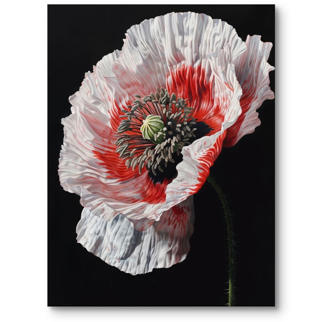 Ten obraz na płótnie ukazuje zachwycającego maku w pełnym rozkwicie. Centralnym punktem kompozycji jest duży, biały kwiat z delikatnymi czerwonymi akcentami na płatkach, które subtelnie odcinają się na głębokim, czarnym tle. Obraz podkreśla niezwykłą urodę natury i wydobywa z niej najdrobniejsze szczegóły, pozwalając widzowi zatrzymać się na chwilę przy wyrafinowanej formie maku.