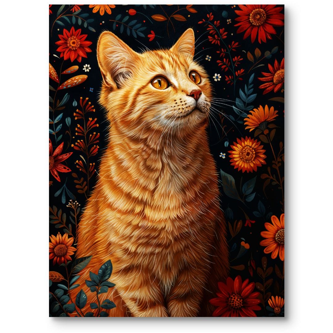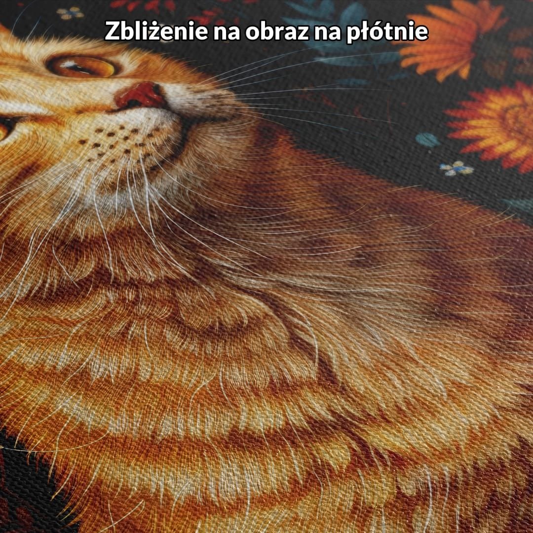 Obraz na płótnie przedstawia dostojnego rudego kota otoczonego bujną roślinnością oraz różnorodnymi kwiatami. Przenikliwe spojrzenie kota i jego urzekające umaszczenie czynią go centralnym punktem kompozycji, podczas gdy tętniące życiem otoczenie buduje harmonijną, malowniczą scenerię. Dzieło wyróżnia się bogactwem detali oraz ciepłą, energetyczną kolorystyką, dzięki czemu staje się wyjątkowym akcentem zarówno w klasycznych, jak i nowoczesnych przestrzeniach.