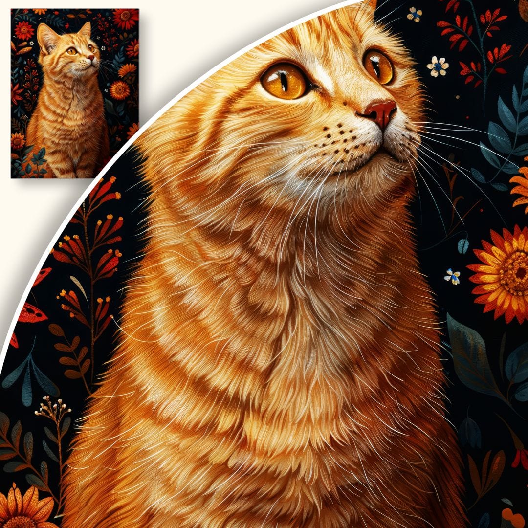 Kompozycja została starannie zaplanowana – rudy kot zajmuje centralne miejsce, przyciągając spojrzenia widzów, a otaczające go rośliny oraz kwiaty tworzą zbalansowaną, przyjazną dla oka całość. Dominują ciepłe odcienie pomarańczu, czerwieni oraz głębokiej czerni, nadając dziełu witalności i dynamiki. Subtelne światło podkreśla grację kota oraz elegancję całej sceny.