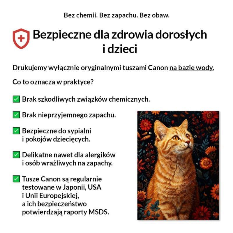 Tak, absolutnie! Drukujemy wyłącznie certyfikowanymi, bezwonnymi tuszami pigmentowymi Canon Lucia Pro na bazie wody. Są one w pełni bezpieczne dla zdrowia, nie zawierają rozpuszczalników i mogą być bez obaw stosowane w sypialniach i pokojach dziecięcych.