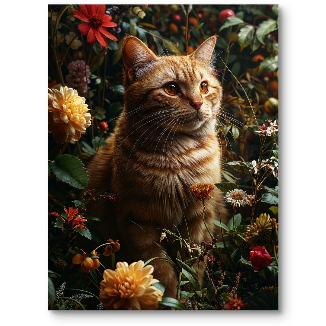 Obraz przedstawia urokliwego, pomarańczowego kota, który z gracją zasiada pośród rozkwitających, barwnych kwiatów. Tło z zielonymi liśćmi nadaje kompozycji głębi i podkreśla jej naturalny charakter. Kot o hipnotyzującym spojrzeniu, w pełni zatopiony w pięknie otaczającej go przyrody, staje się tu symbolem harmonii między zwierzęciem a światem roślin.
