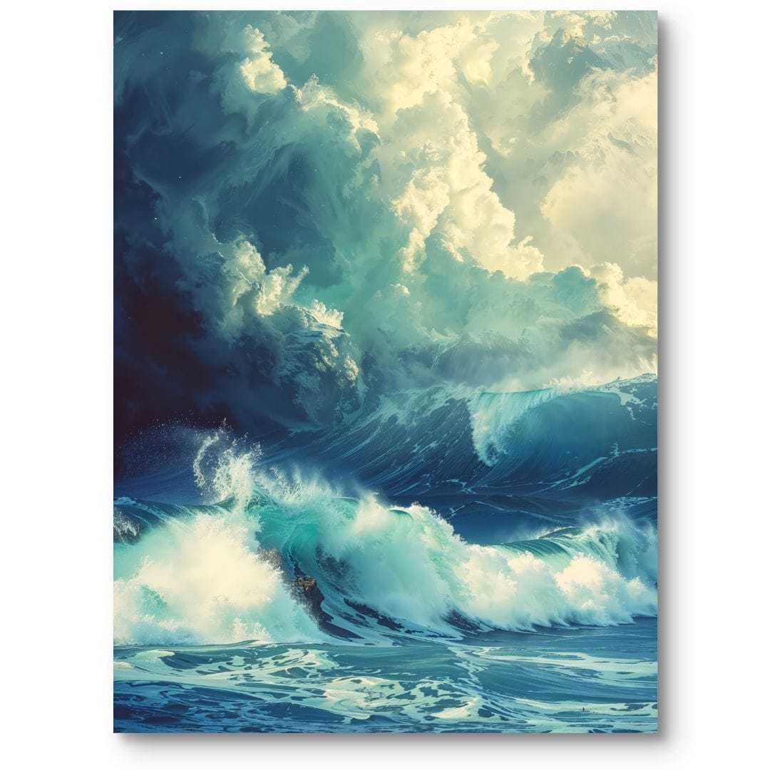 Ten obraz na płótnie przedstawia burzliwe morze, na którym potężne fale ścierają się ze sobą, tworząc widowiskowy spektakl żywiołów. Nad wodami unoszą się ciężkie chmury, które potęgują dramatyzm i aurę tajemniczości całości. Kompozycja uchwycona została w jednym, niezwykle ekspresyjnym ujęciu, pozwalając zatrzymać piękno i energię natury na zawsze.