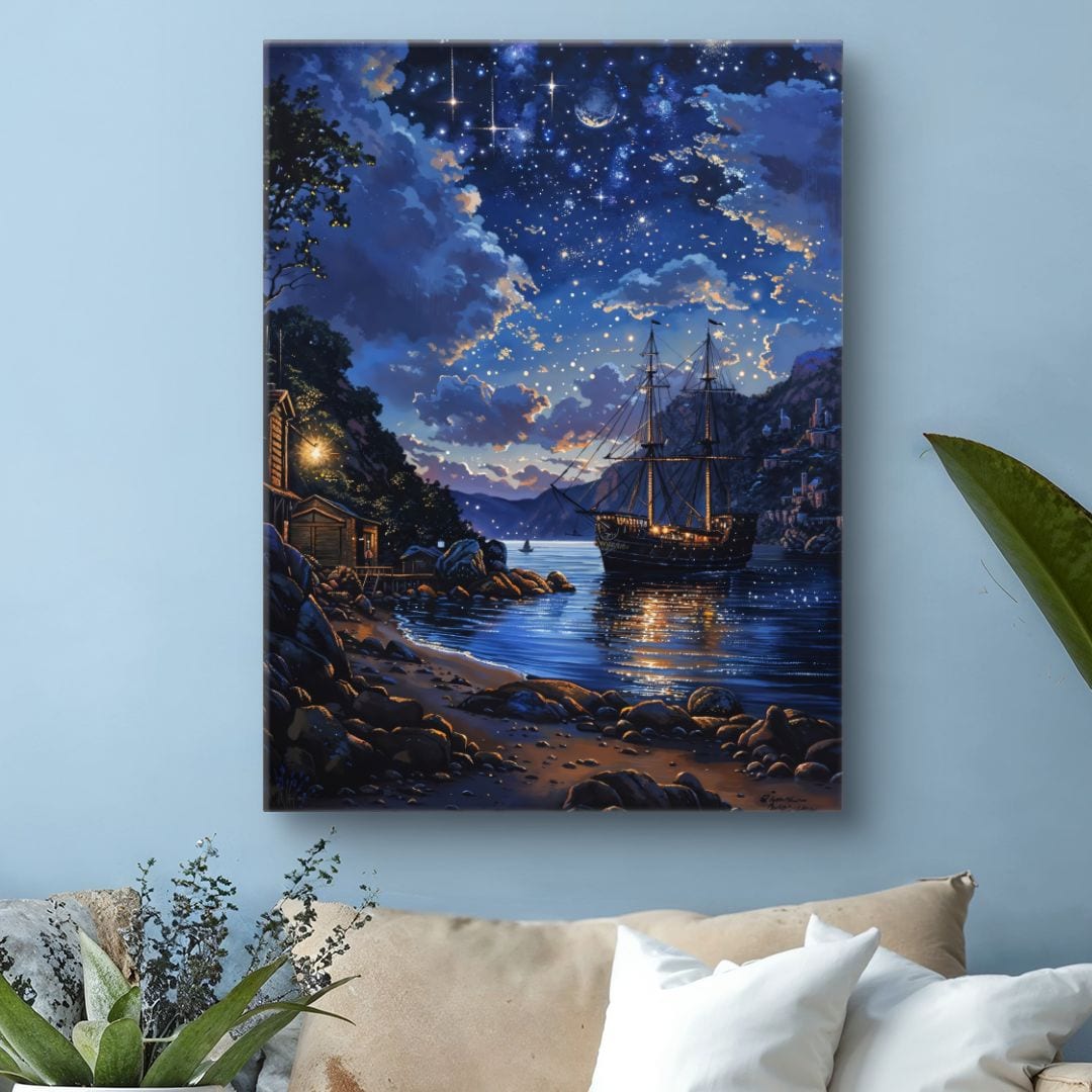 Obraz na płótnie przedstawia nastrojowy, spokojny pejzaż nocny nad morzem. Na pierwszym planie, przy cichym brzegu, spoczywa statek, jakby tuż po zakończonej podróży. W oddali maluje się monumentalny widok gór, a nad całą scenerią rozpościera się rozgwieżdżone, głębokie niebo. Migoczące gwiazdy i świetlisty księżyc tworzą niezwykłą, niemal bajkową aurę.