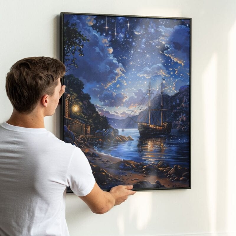Obraz emanuje wyjątkowym spokojem, sprzyjając wyciszeniu, refleksji, czy medytacji. Cumujący statek staje się metaforą podróży, marzeń i odkrywania nieznanego, a gwiazdy oraz księżyc symbolizują nadzieję, inspirację i bezkres możliwości.