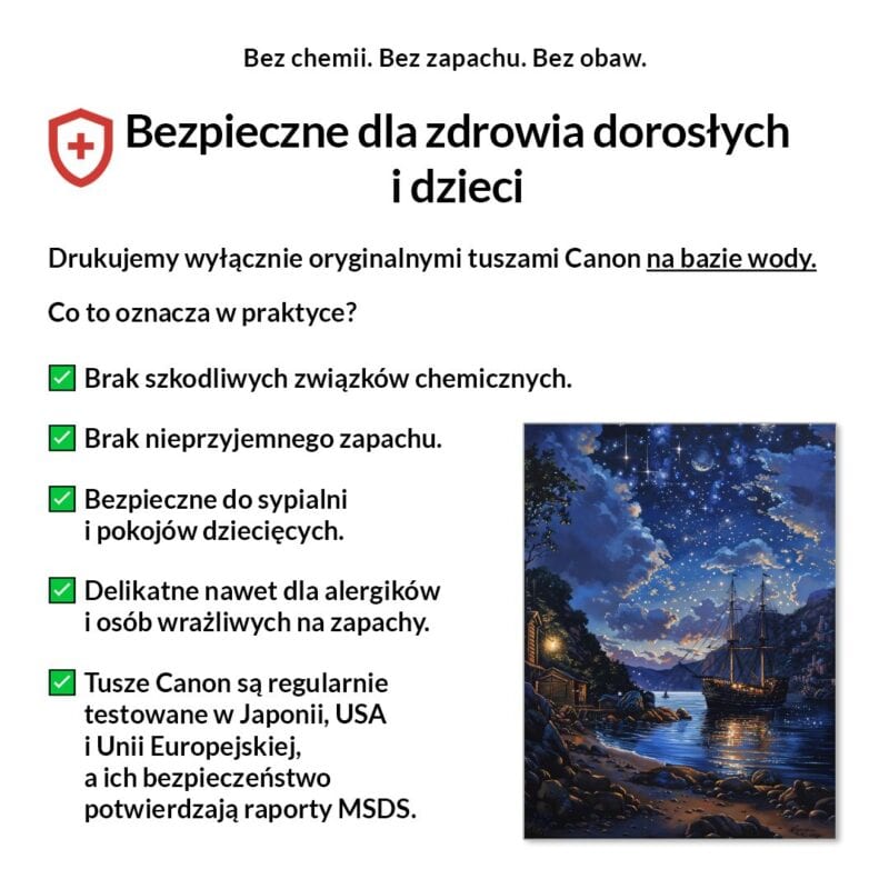 Tak, absolutnie! Drukujemy wyłącznie certyfikowanymi, bezwonnymi tuszami pigmentowymi Canon Lucia Pro na bazie wody. Są one w pełni bezpieczne dla zdrowia, nie zawierają rozpuszczalników i mogą być bez obaw stosowane w sypialniach i pokojach dziecięcych.