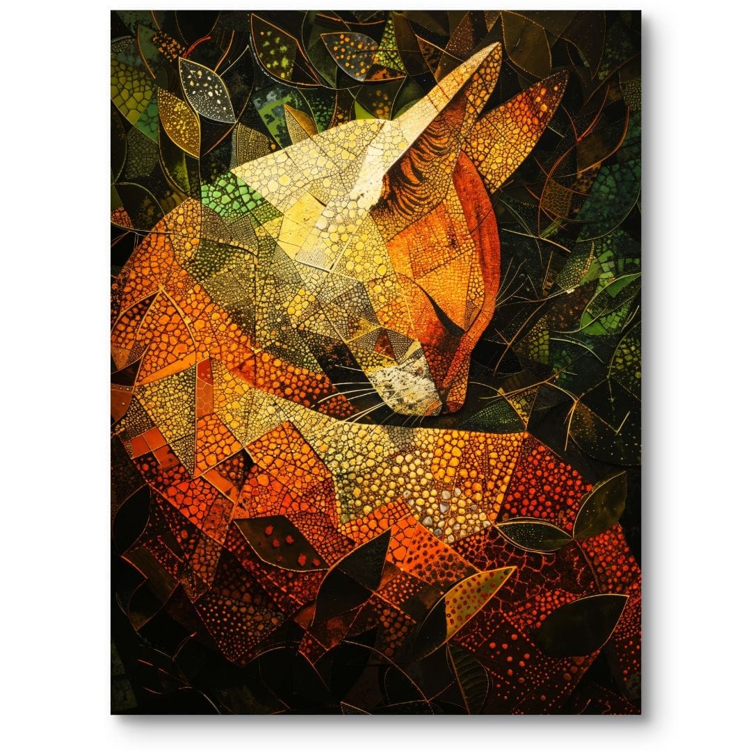 Obraz na płótnie przedstawia barwny portret kota, wykonany w oryginalnym stylu łączącym mozaikę z kubizmem. Intensywne, cukierkowe kolory zapraszają widza do urzekającego świata natury, a ostre linie i wyraziste geometryczne kształty tworzą nietuzinkową sylwetkę zwierzęcia.
